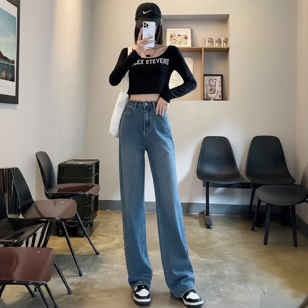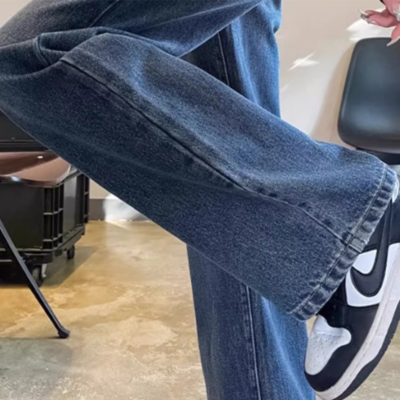 Celana Jeans Wanita Biru Retro High Waist Wide Leg Celana Panjang dengan Tekstur Menggantun
