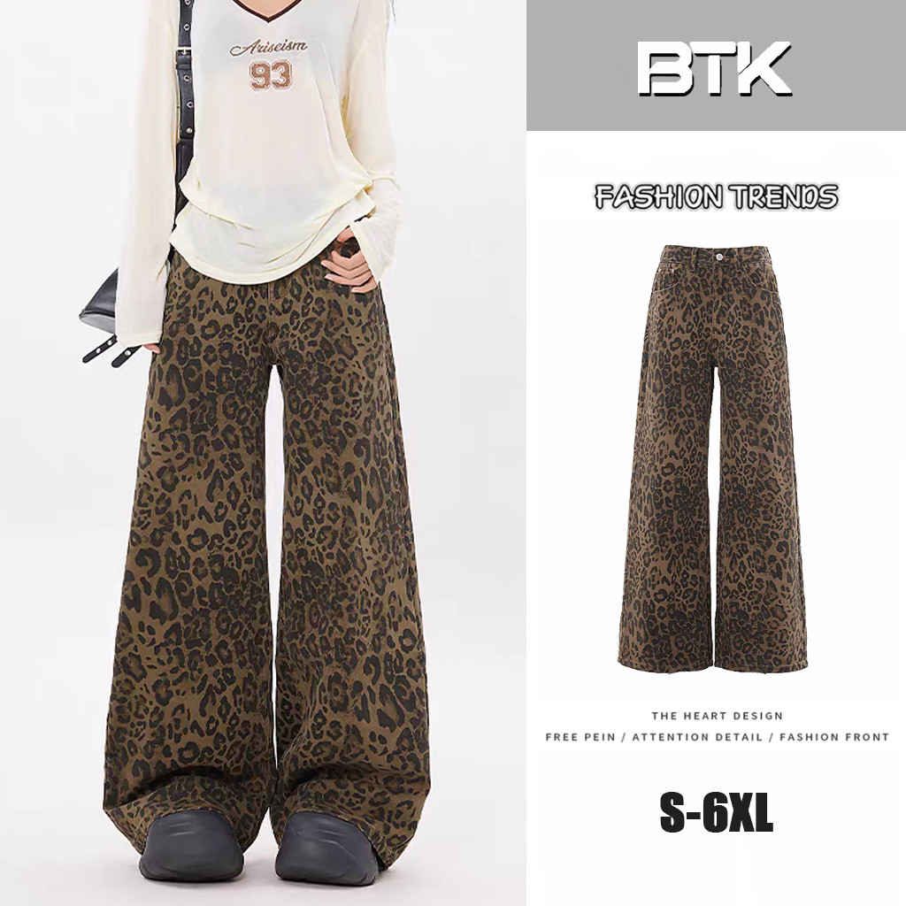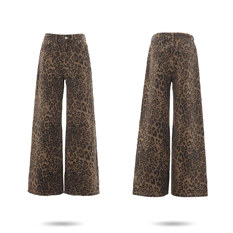BUTIK Celana Jeans Motif Macan Tutul Wanita Kasual Retro Mid Waist Wide Leg Denim Pants Loose Fit