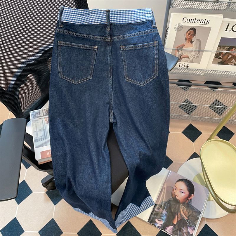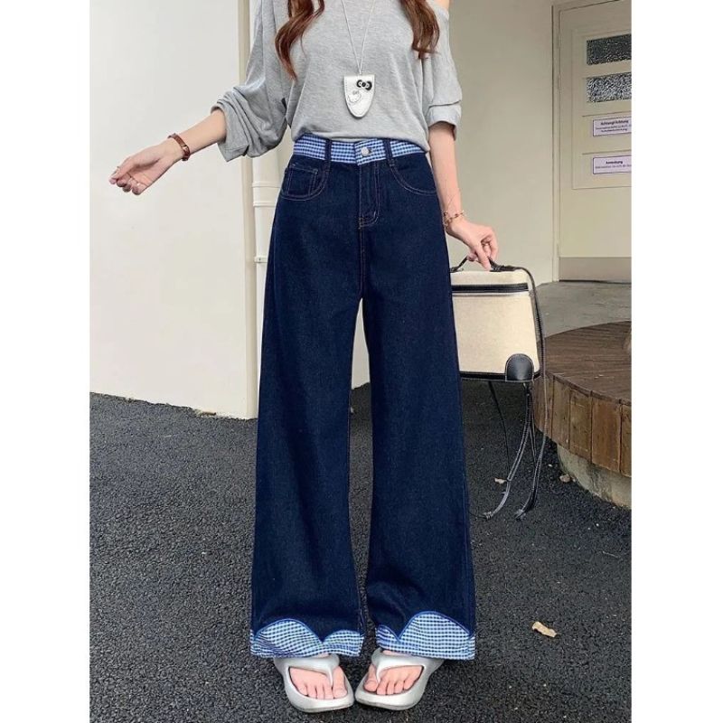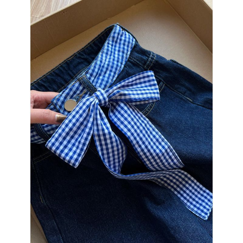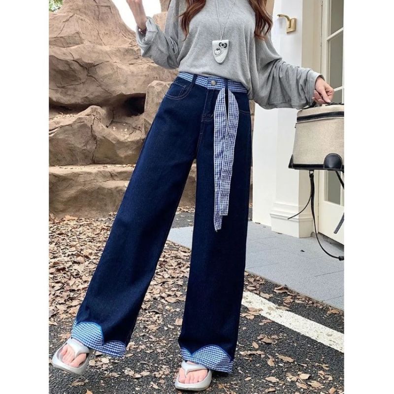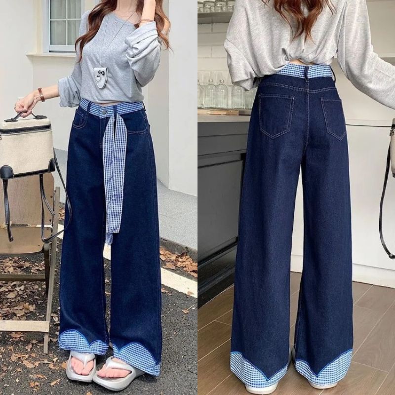 Jeans Wanita Highwaist Wide Leg Korea Style • Celana Panjang Patchwork Kotak-Kotak • Model Longgar Chic Dengan Ikat Pita