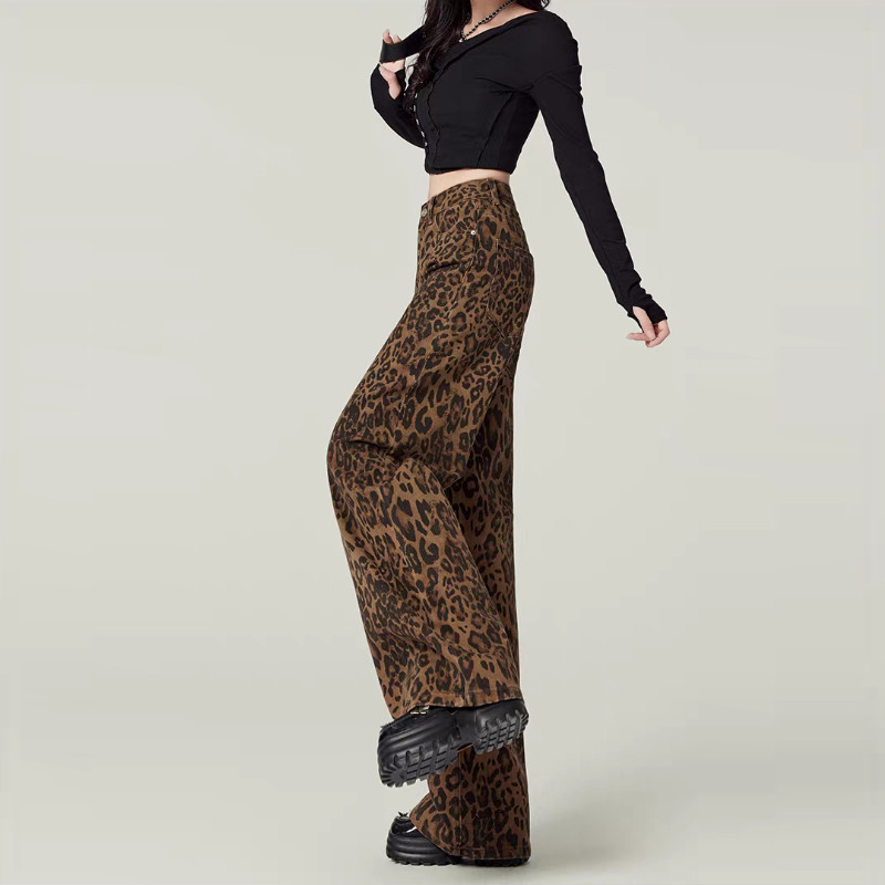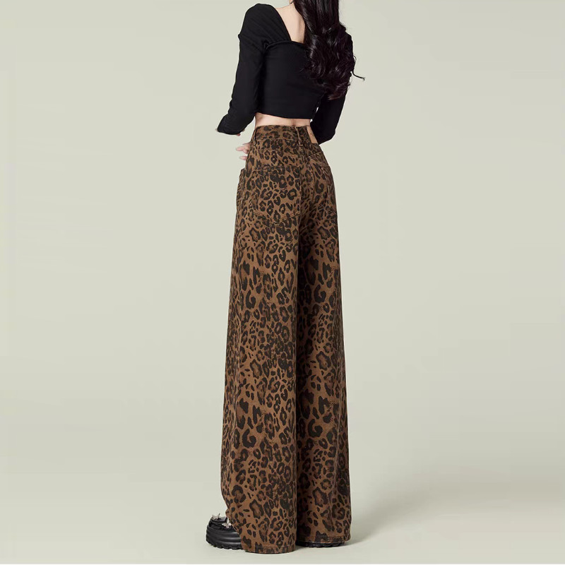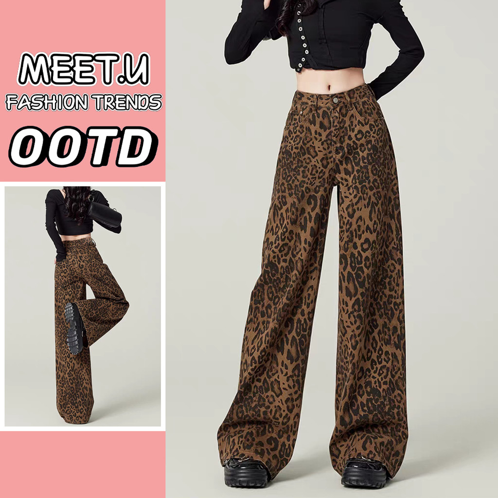 MEET.U Jeans Motif Macan Tutul Wanita Gaya Retro Korean Style Mid Waist Wide Leg Kasual Denim Pants