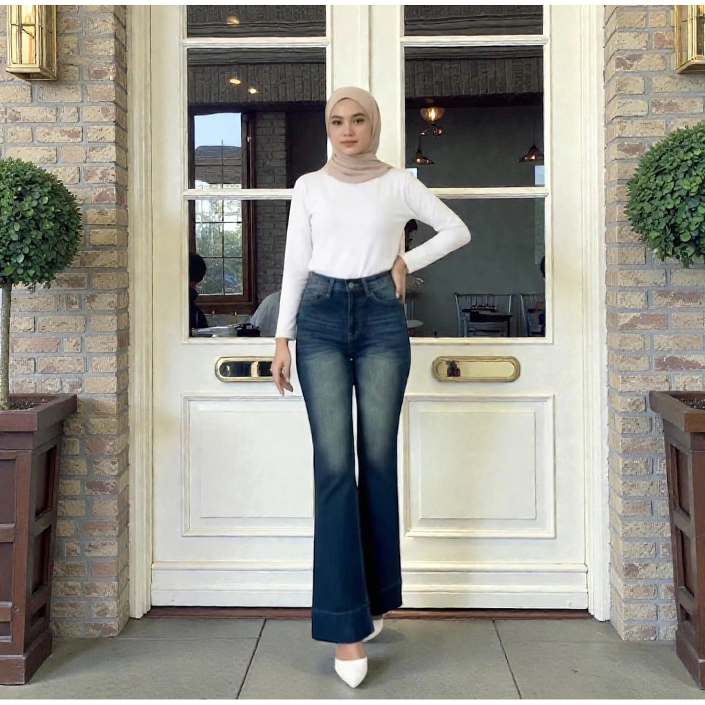 Jennie-HighWaist Cutbray Jeans Celana Flare Panjang Stretch Wanita Retro Vintage Lipat Bawah