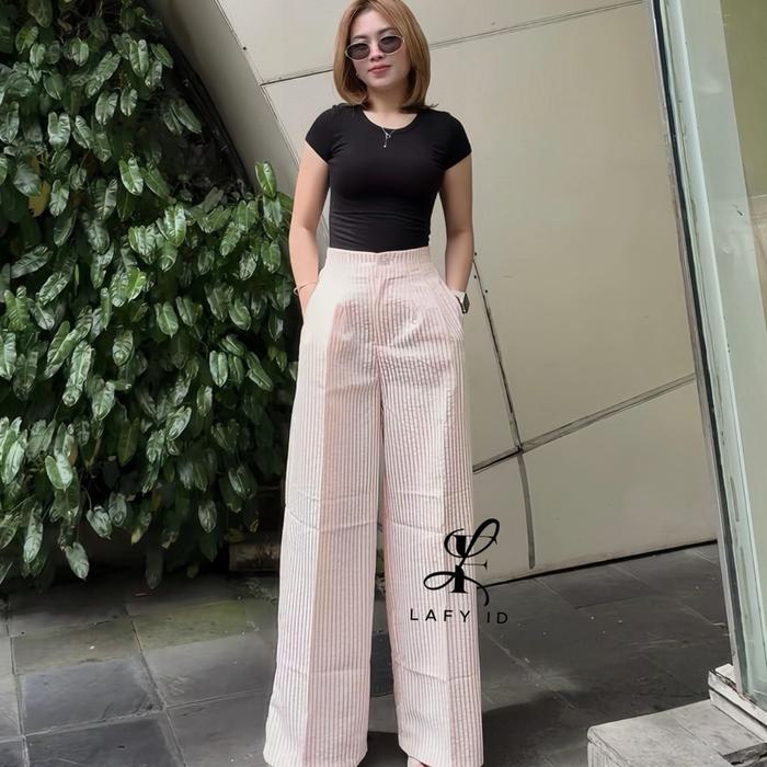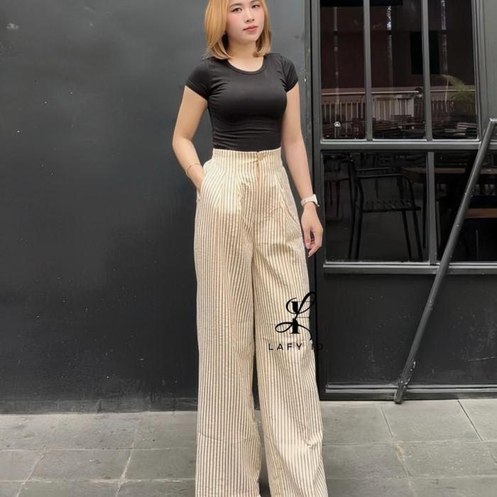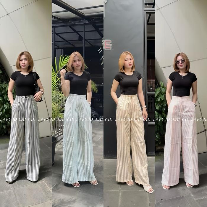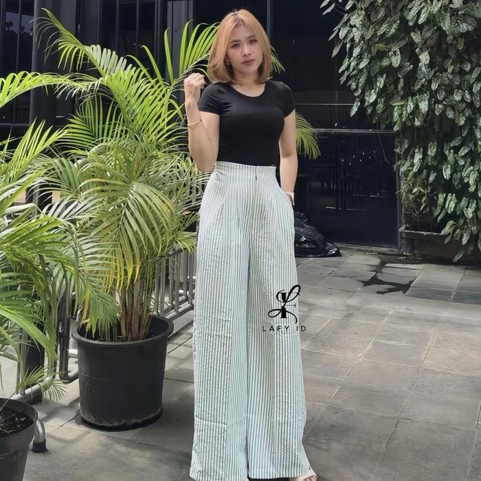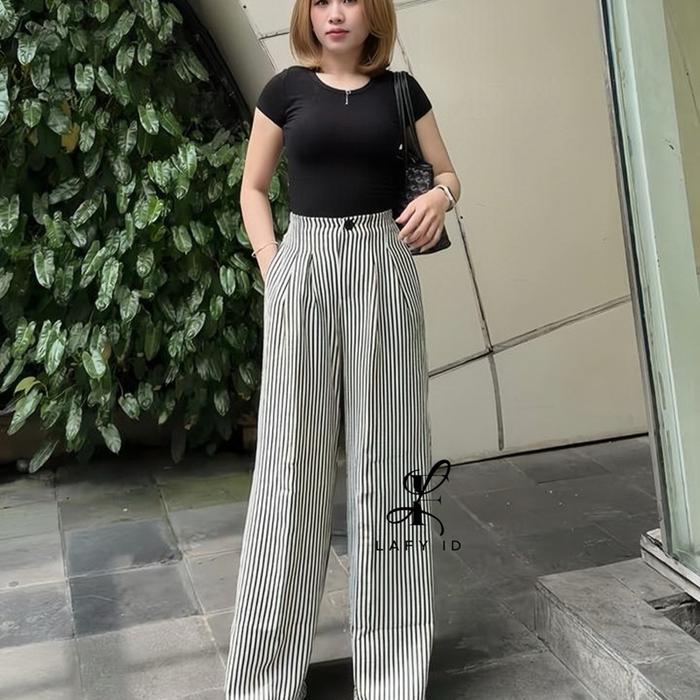 LAFY.ID - STRIPE PANTS - CELANA PANJANG WANITA SALUR WIDE LEG PANTS STRIPE KULOT GOMBRONG BAHAN KATUN MODEL TERBARU - BLACK TEXTURE, STANDART BB35-55KG