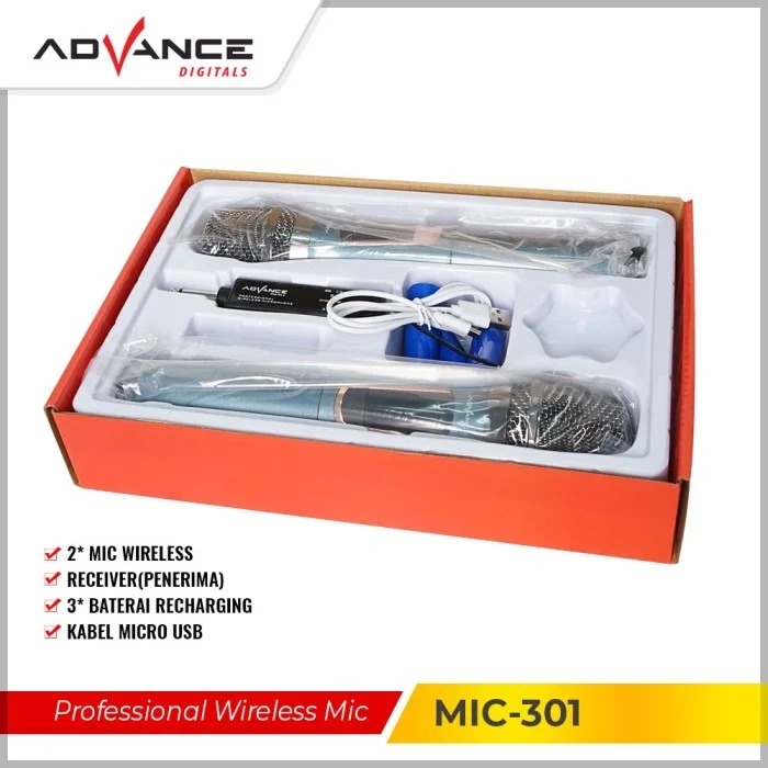 Advance MIC 301 | Mic-301 Microphone Wireless Double Mic Baterai Tanam Bisa Charge