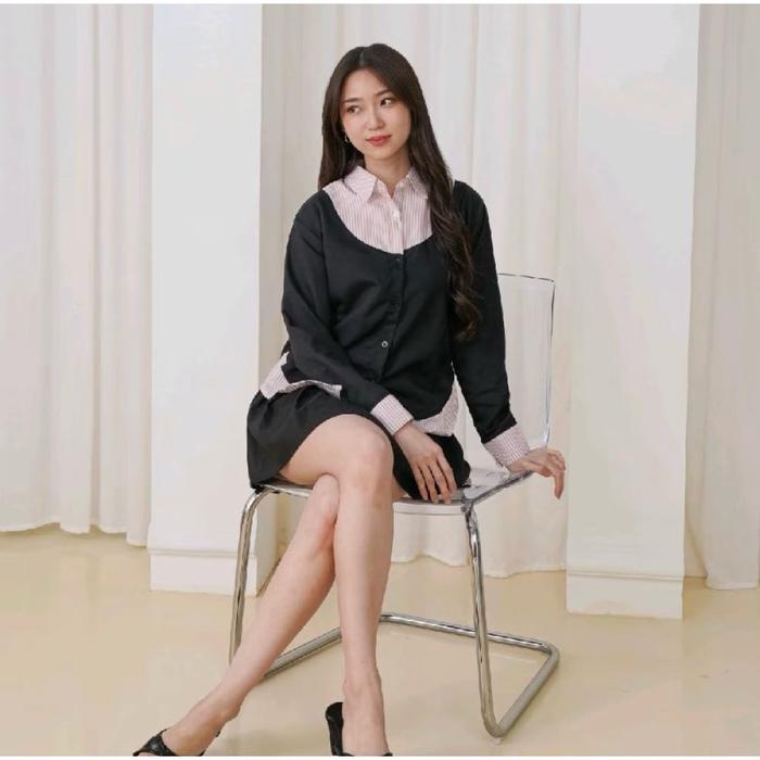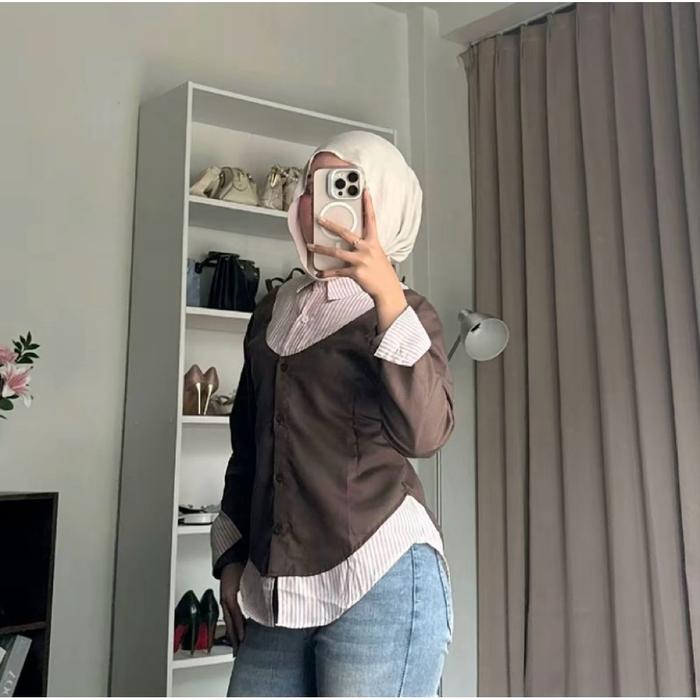 PRODUK LOKAL - KEMEJA WISPI YEREUU SHIRT KEMEJA BLOUSE WANITA KOMBINASI LAYER STRIPE WARNA PINK, BIRU, DAN CREAM KEMEJA 2IN1 - HITAM STRIPE BIRU, L