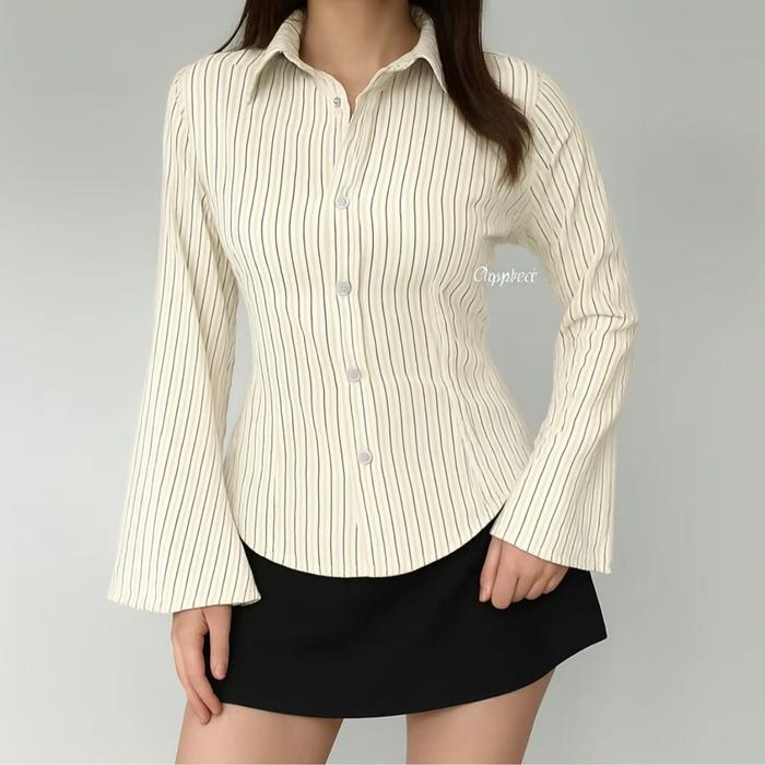 KEMEJA WHISPIE ATASAN WANITA KEKINIAN – MOTIF SALUR GARIS STRIPE SLIM FIT BODY, LENGAN FLARE PREMIUM NYAMAN - IVORY, M