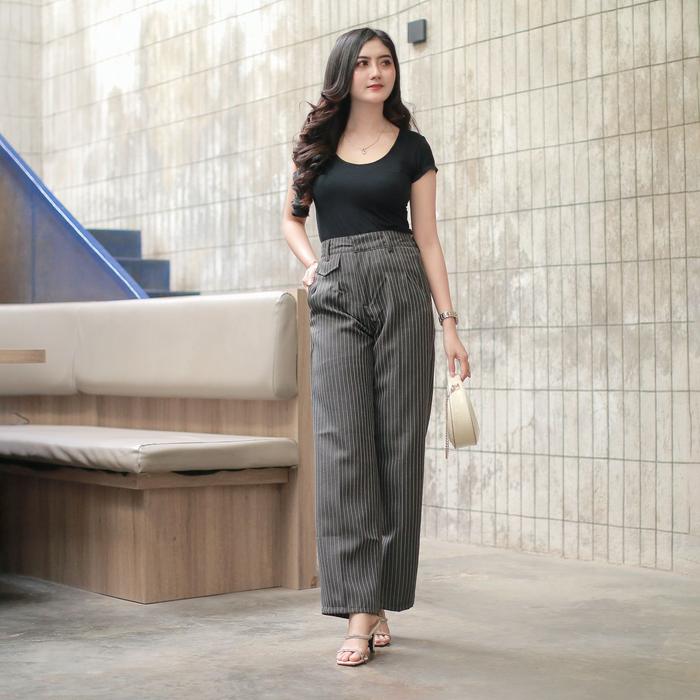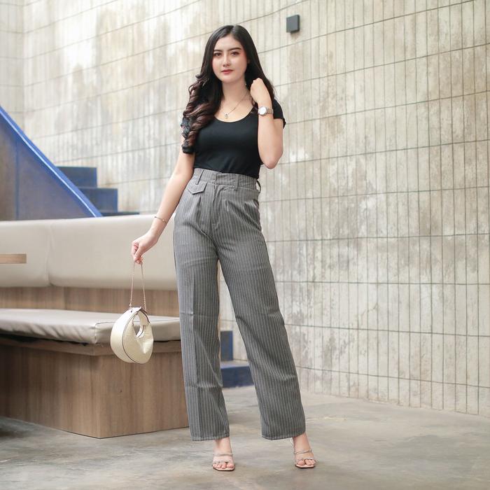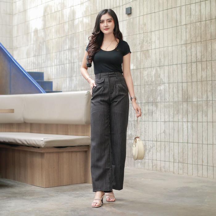 ORO PANTS STRIPE BANGKOK - CELANA ANTI KUSUT - CELANA PANJANG KOREAN STYLE - CELANA HIGHWAIST WANITA - HITAM, M BB 38-48 KG
