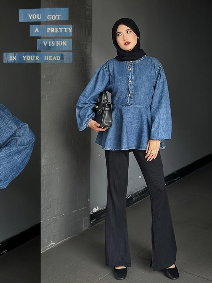 LA WEAR AEERA BLOUSE DENIM WANITA ATASAN KEMEJA JEANS NYAMAN FORMAL LENGAN PANJANG PEPLUM OVERSIZE BAJU SANTAI SOFT JEANS PREMIUM - AEERA DARK BLUE, STANDAR