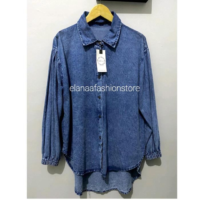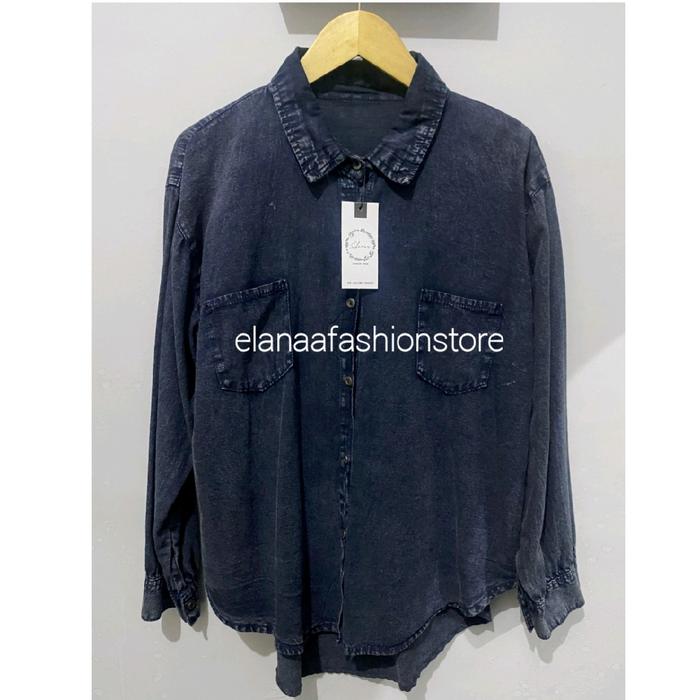 KEMEJA JEANS WANITA OVERSIZE // KEMEJA JEANS WANITA TERBARU - SNOW BLACK SAKU, ALL SIZE LD 120CM
