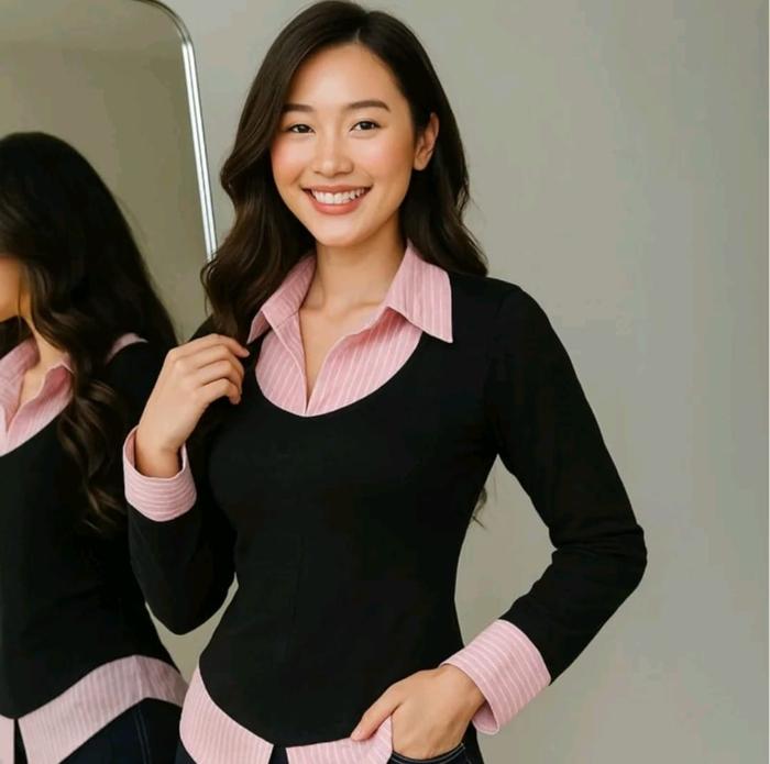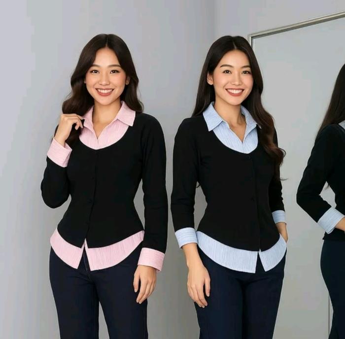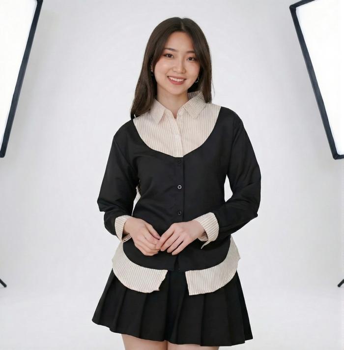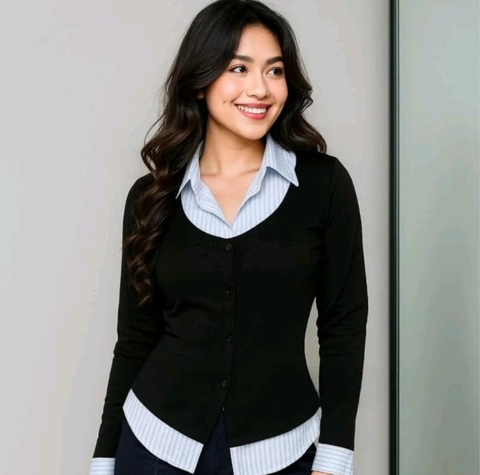 GOODZAYN - YAREU WISPIE GIRL BOSS FITTED SHIRT | KEMEJA KERJA WANITA KOMBINASI FIT GARIS STRIPE KARET LEMBUT - YAREU BLACK BLUE, M LD 100