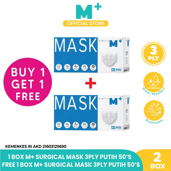 Masker Medis Earloop 3 Ply Paket 2 Box- Surgical Mask Isi 50 Pcs Putih - 2 Box M+ Surgical Mask Earloop 3 Ply - Putih
