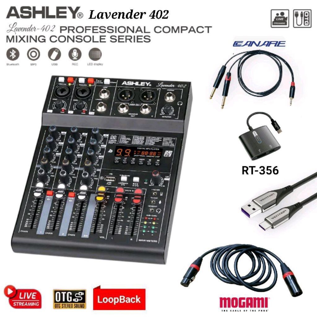 Paket Mixer Audio ASHLEY Lavender 402 With Loopback Anti Doubling Kabel Lengkap Mic Audio OTG Live Streaming Original