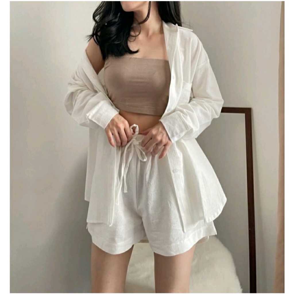 Oneset Setelan Kemeja Wanita Lengan panjang dan Celana pendek Set wanita Korean Style Linen Premium