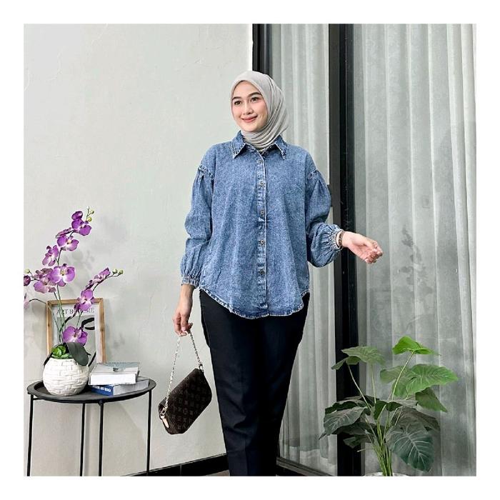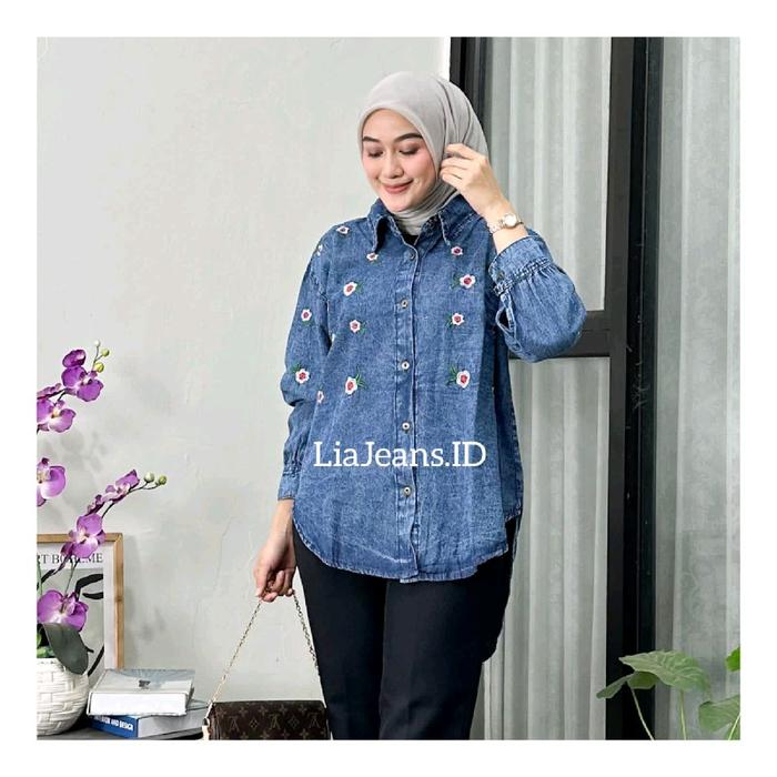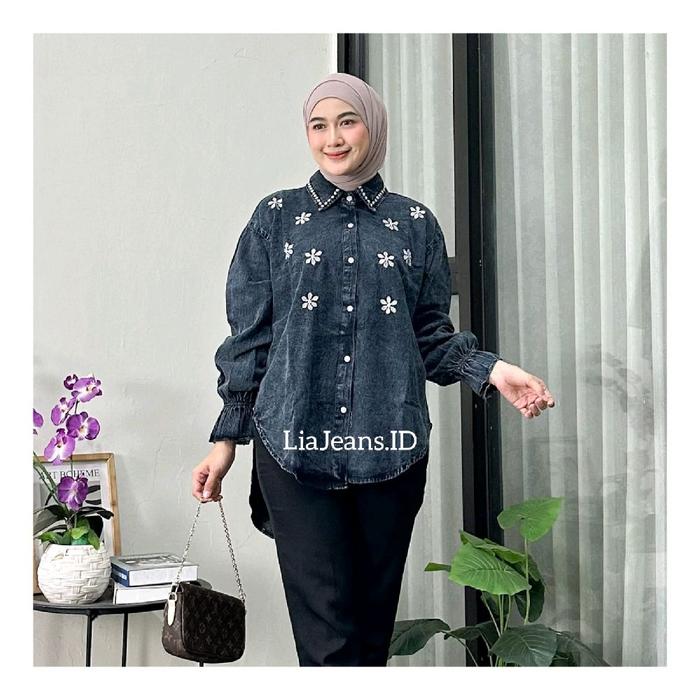 LIAJEANS.ID KEMEJA JEANS BORDIR OVERSIZE ATASAN KEMEJA JEANS WANITA BORDIR TERBARU BUSUI & WUDHU FRIENDLY BAHAN TEBAL MUAT BB 40-87KG - KEMEJA BORDIR SNOW BLACK, LINGKAR DADA 120CM