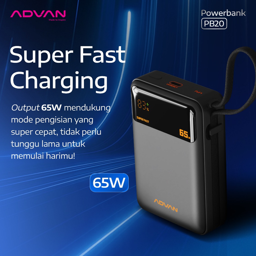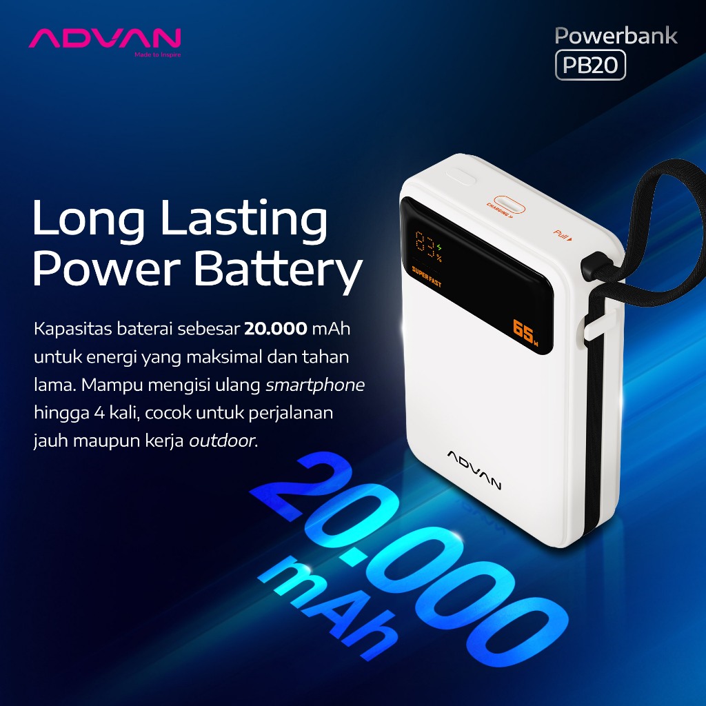 Advan Powerbank Pb20 | 20.000Mah | 65W Super Fast Charging | Built-In Type-C Cable | Dual Port | Slim & Compact Design |