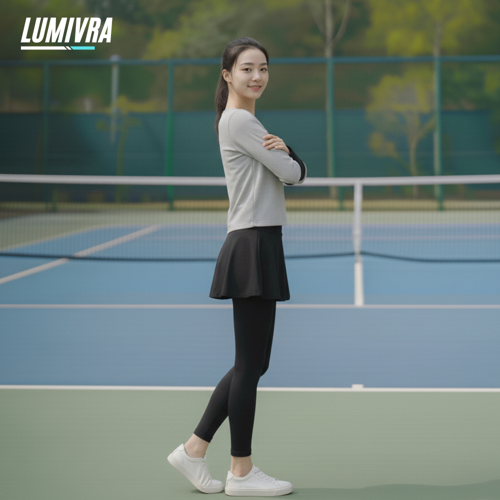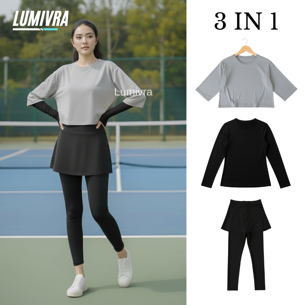 Setelan Olahraga Wanita Muslimah 3 IN 1 Kaos Crop Oversize + Manset + Legging Rok Sporty Gym Running