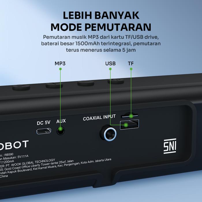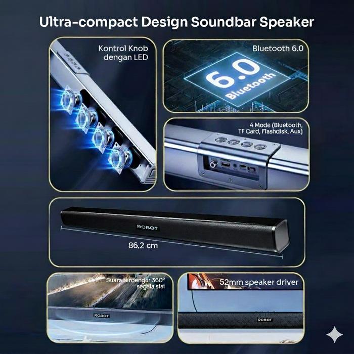 ROBOT SOUNDBAR SPEAKER TV RB590 WIRELESS 6.0 HOME THEATER DUAL CONNECTION ULTRA-COMPACT DESIGN GARANSI 1 TAHUN SPEAKER BLUETOOTH BASS 10W 52MM DRIVER BASS BOMBASTIS KUALITAS TINGGI