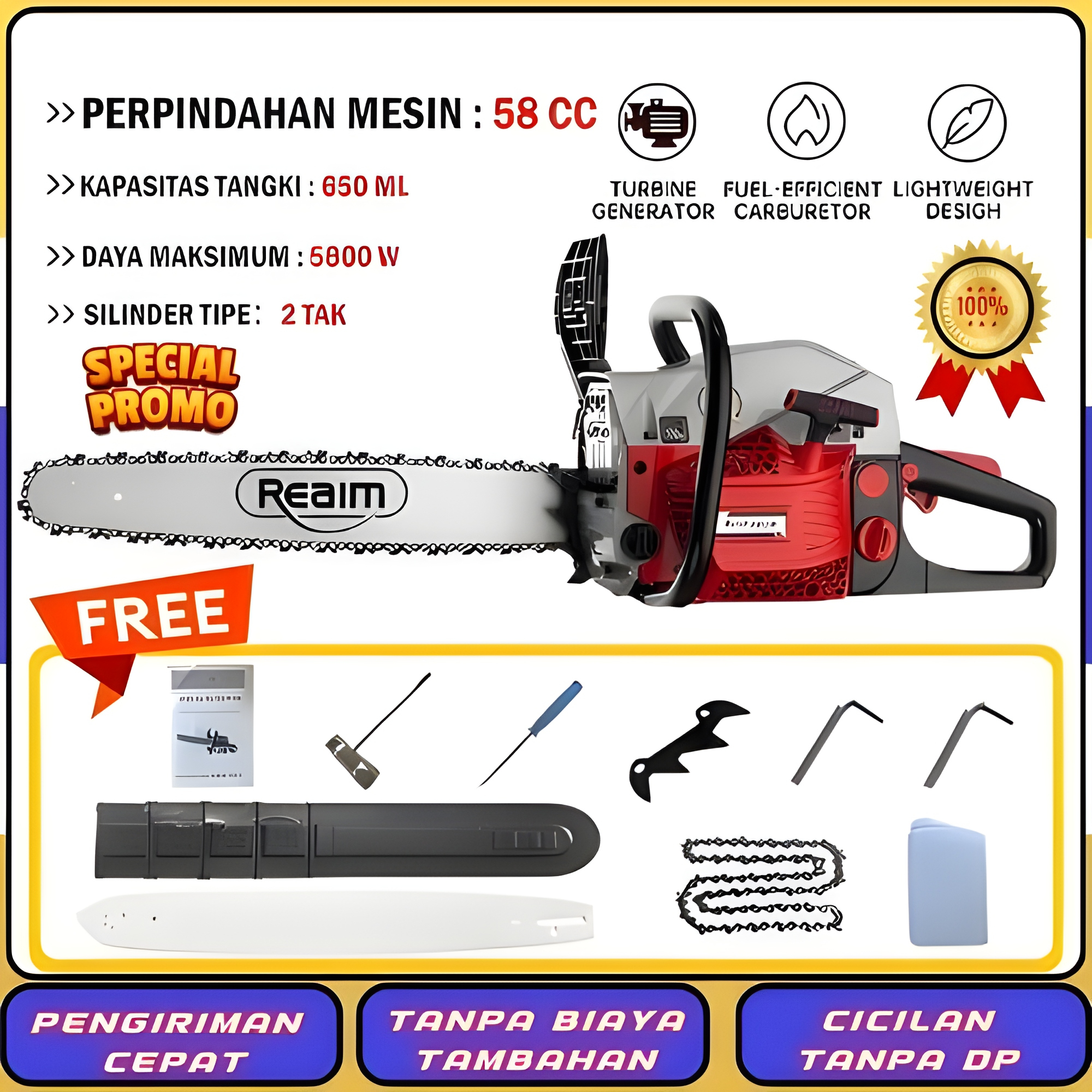 Gergaji Mesin Pemotong Kayu Reaim 58CC 20 Inch Mesin Sinso Senso Chainsaw 2Tak Mini Original