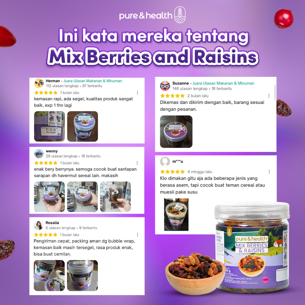 MIX BERRY AND RAISIN 250 GR PURE AND HEALTH CEMILAN SEHAT BUAH KERING KISMIS CRANBERRY GOJI BERRY