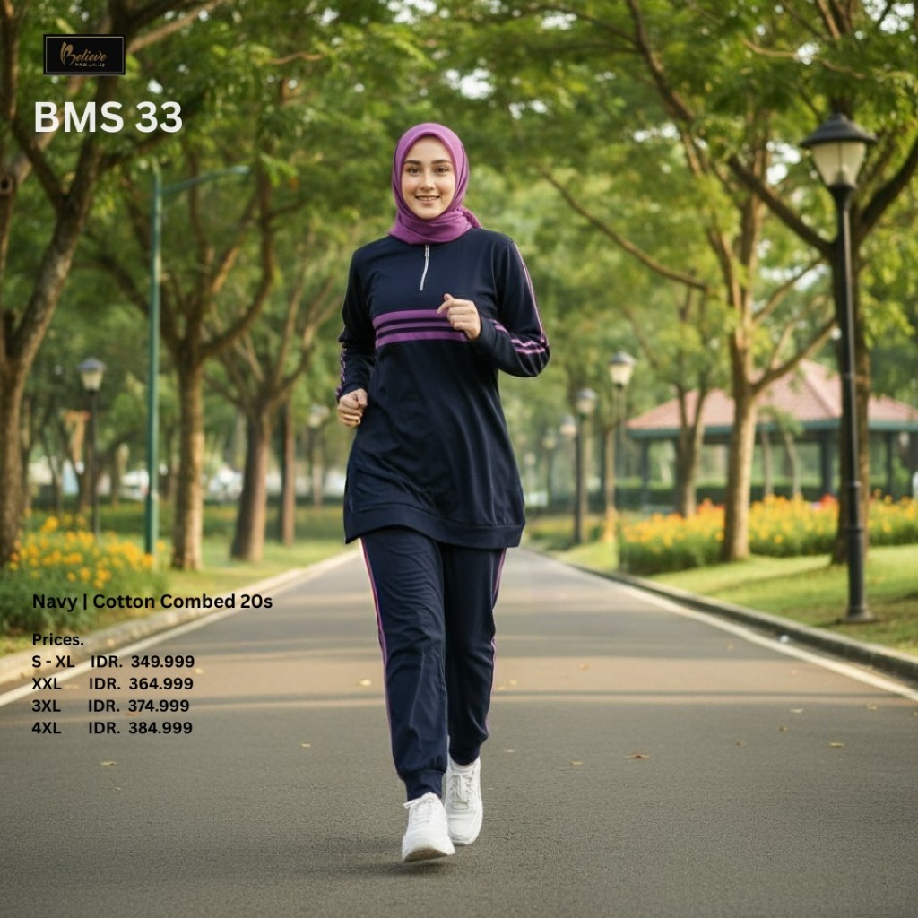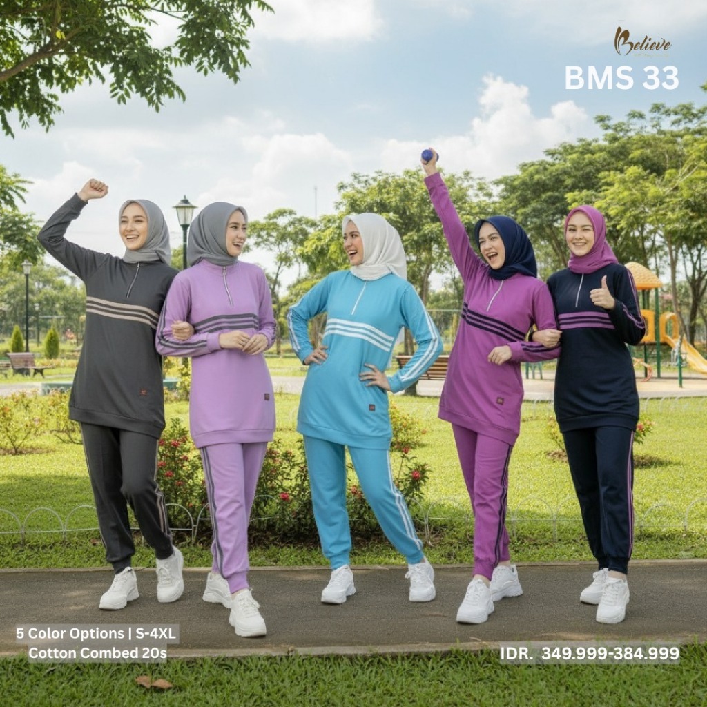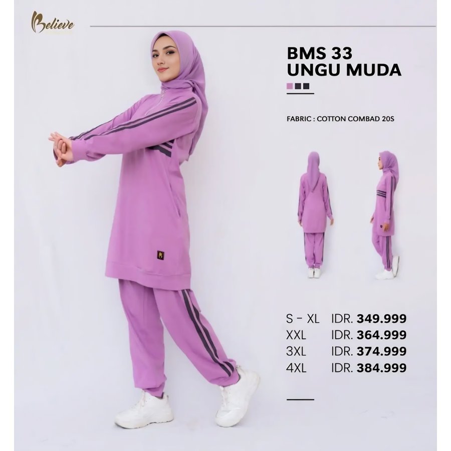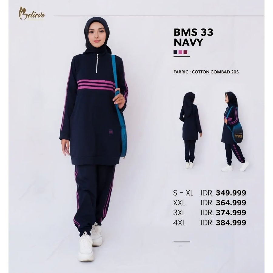 BMS 33 Believe Setelan Kaos Olahraga Katun Combed 20s Wanita Muslimah Oneset Sport Gowes Bulutangkis Senam Jogging Fadel