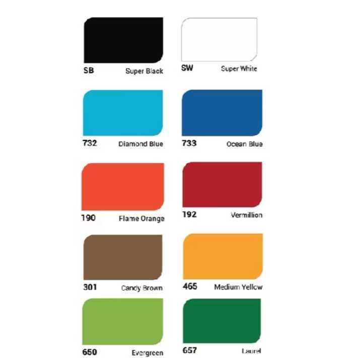 SB super Black, SW super white, SBM Super Black Matt, SWM Super White Matt, 660 Aloe Vera, 650 Evergreen, 652 Pandan Green, 657 Laurel, 197 Orchid Violet, 198 Candy Pink
