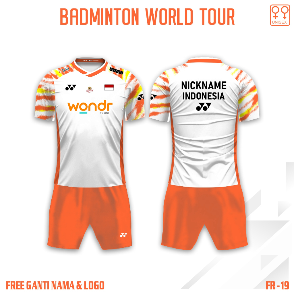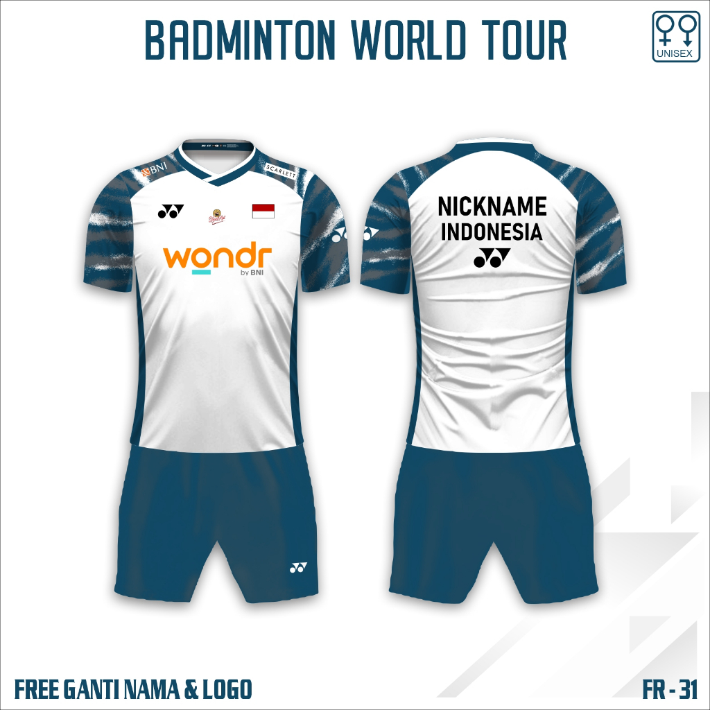 Setelan jersey badminton bwf baju bulu tangkis wolrd tour fajar rian kaos bulutangkis yn FREE custom nama dan logo