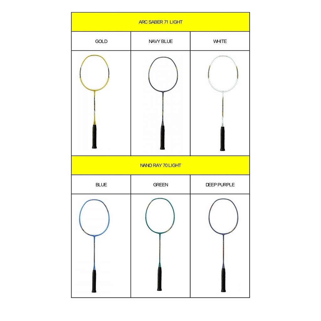 Nanoray 18i Black, Arc 1 Ability Black, Arc 1 Clear Blue, Arc 1 Feel Red, Astrox 27i Navy, Astrox 21i Black, Nanoray 72 Blue, Nanoray 72 Green, Nanoray 72 Dark Red, Nanoray 72 Gold
