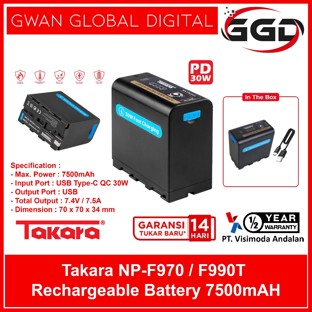 Takara Battery NP-F970 F990T F960 F770 F550 Baterai Rechargeable Battery Pack with USB Output and Type-C Input LED Light
