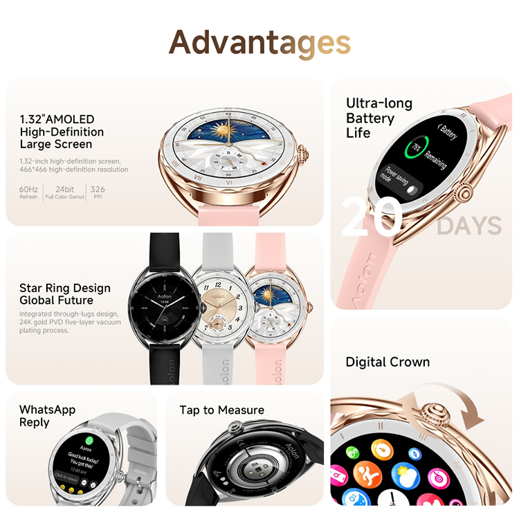 Aolon Nova Smartwatch WA reply 41mm 1.32'' Amoled Layar 60 Hz Tahan Air 1ATM Panggilan Bluetooth Pemantauan Menstruasi