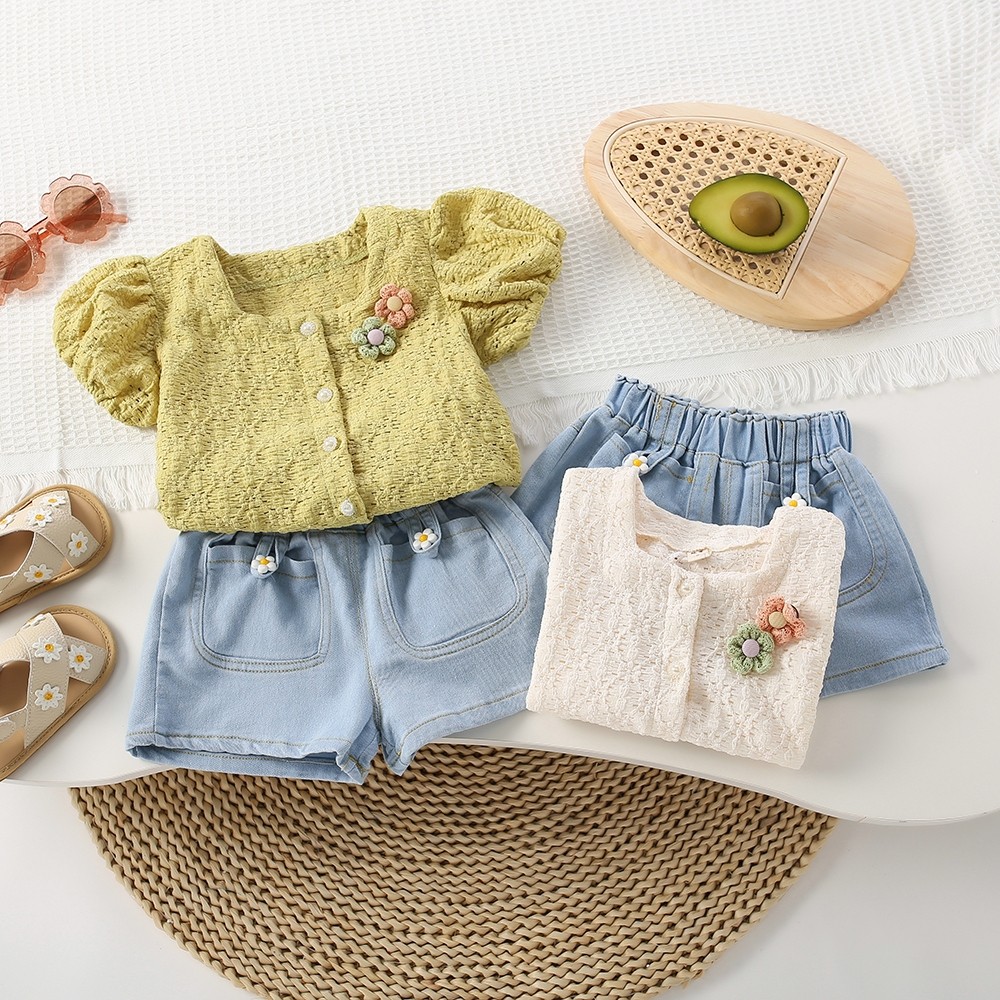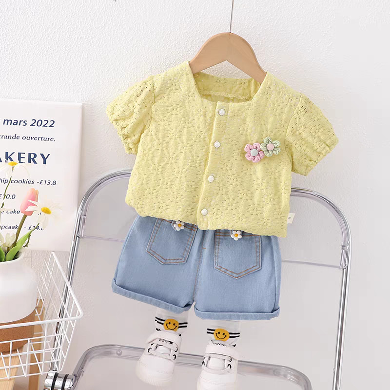 Joyfultots Setelan Lengan Pendek Anak Perempuan Atasan Kardigan Gaya Korea Celana Pendek Denim