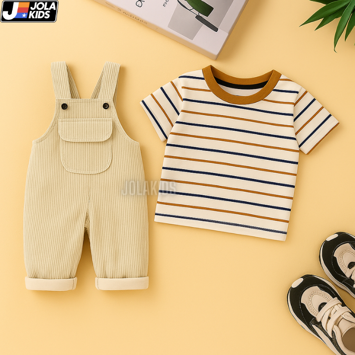 Jola Kids Setelan Anak Laki-Laki & Perempuan Unisex Corduroy Premium Outfit 2In1 Kaos Salur + Overall Jumpsuit Korduroi