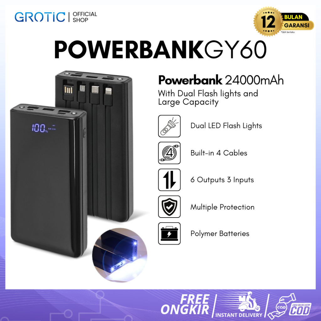 Grotic Powerbank 24000 Mah 6 Output 2 Input 5V 2.1A With Power Display Led Light Gy60