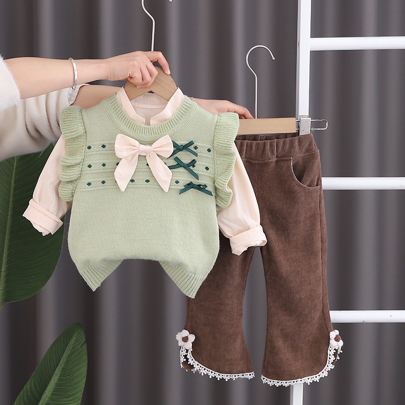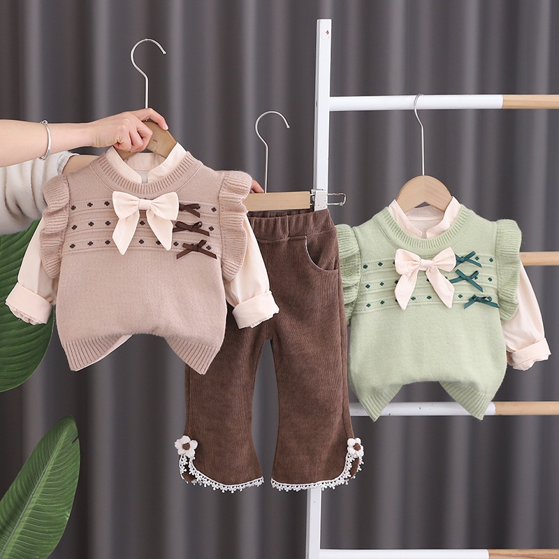 Joyfultots Setelan Anak Perempuan Gaya Korea Rompi Sweter Pita Celana Kasual Set Dua Potong