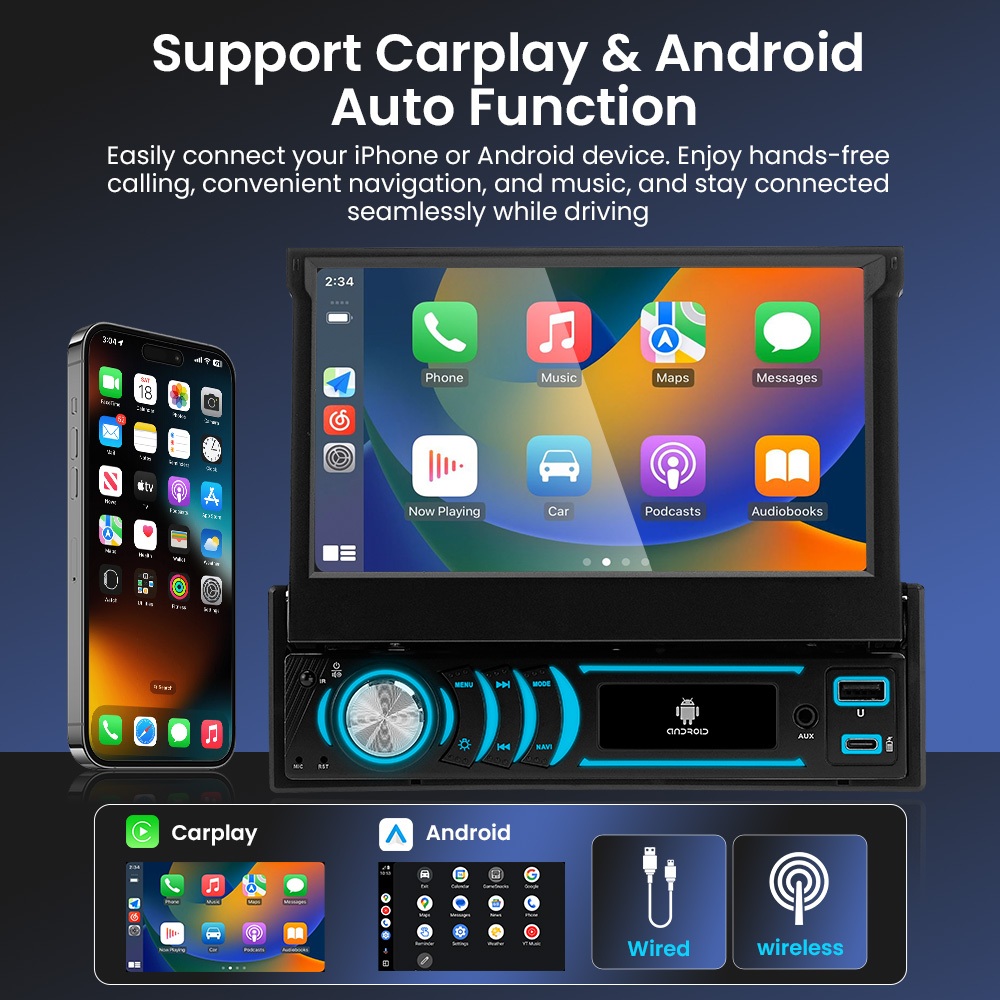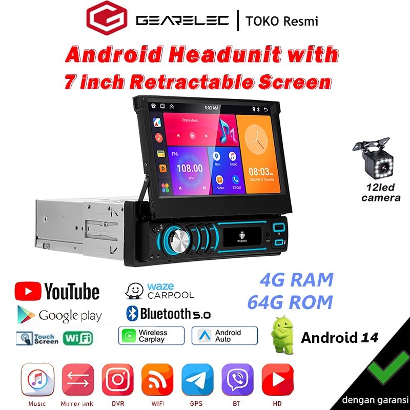 Headunit GEARELEC Single DIN Android 14 4+32G dengan Layar Retractable 7 inci Mendukung WIFI/GPS/Carplay