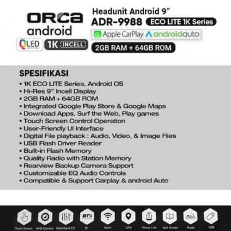 Head Unit Android 9 inch ORCA ADR-9988 ECO LITE SERIES Ram 2GB 64GB QLED 1K INCELL 9inch Mobil ADR9988 ADR 9988 2 GB 64