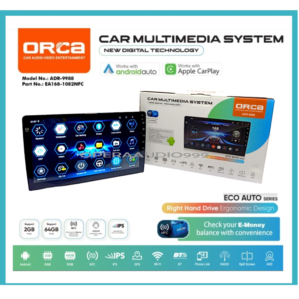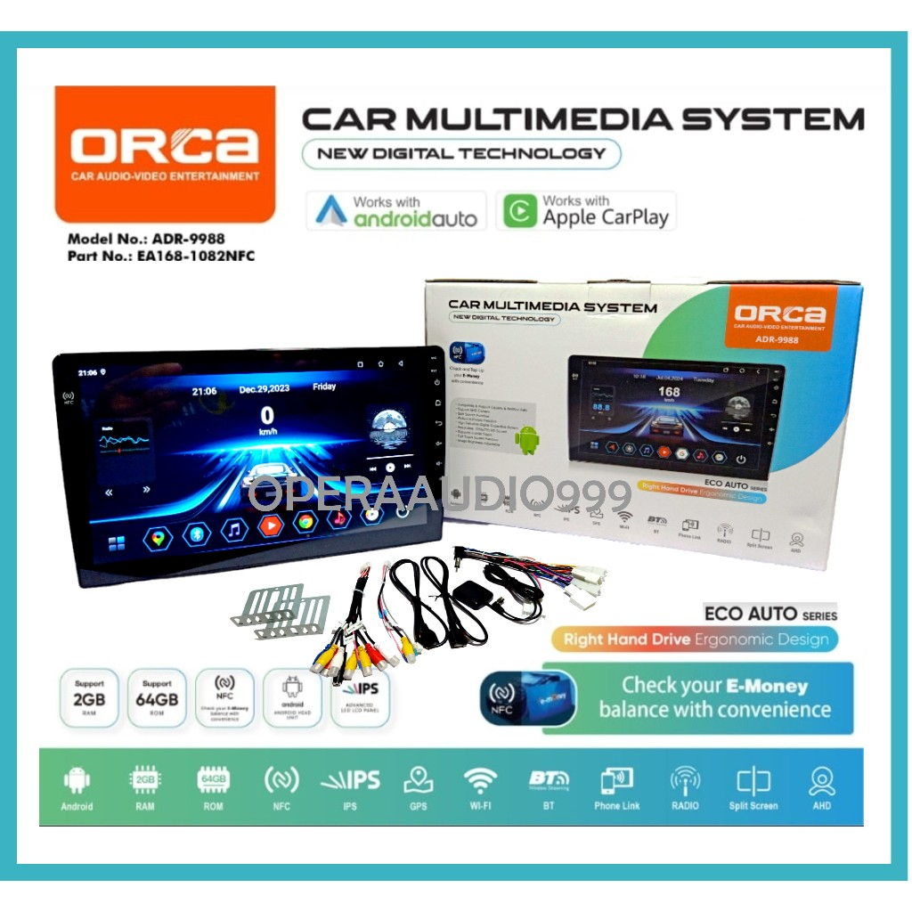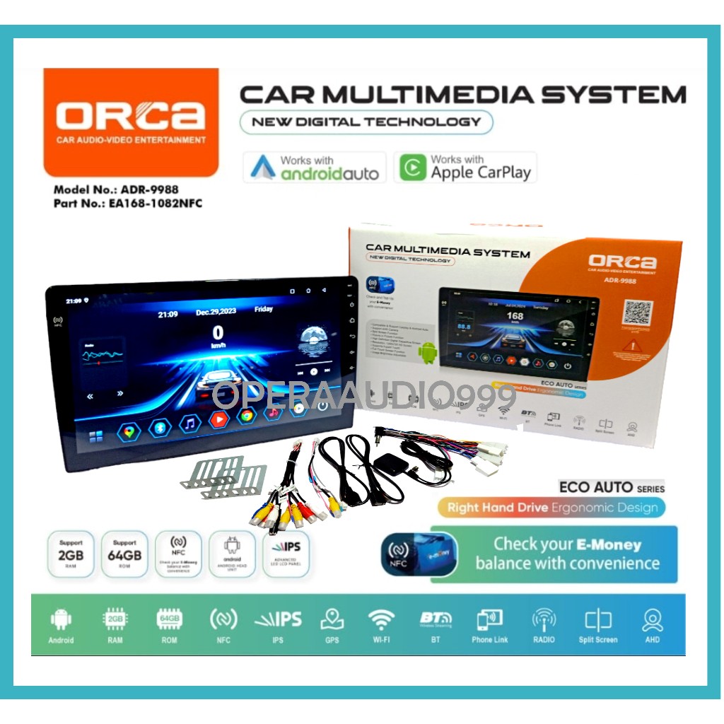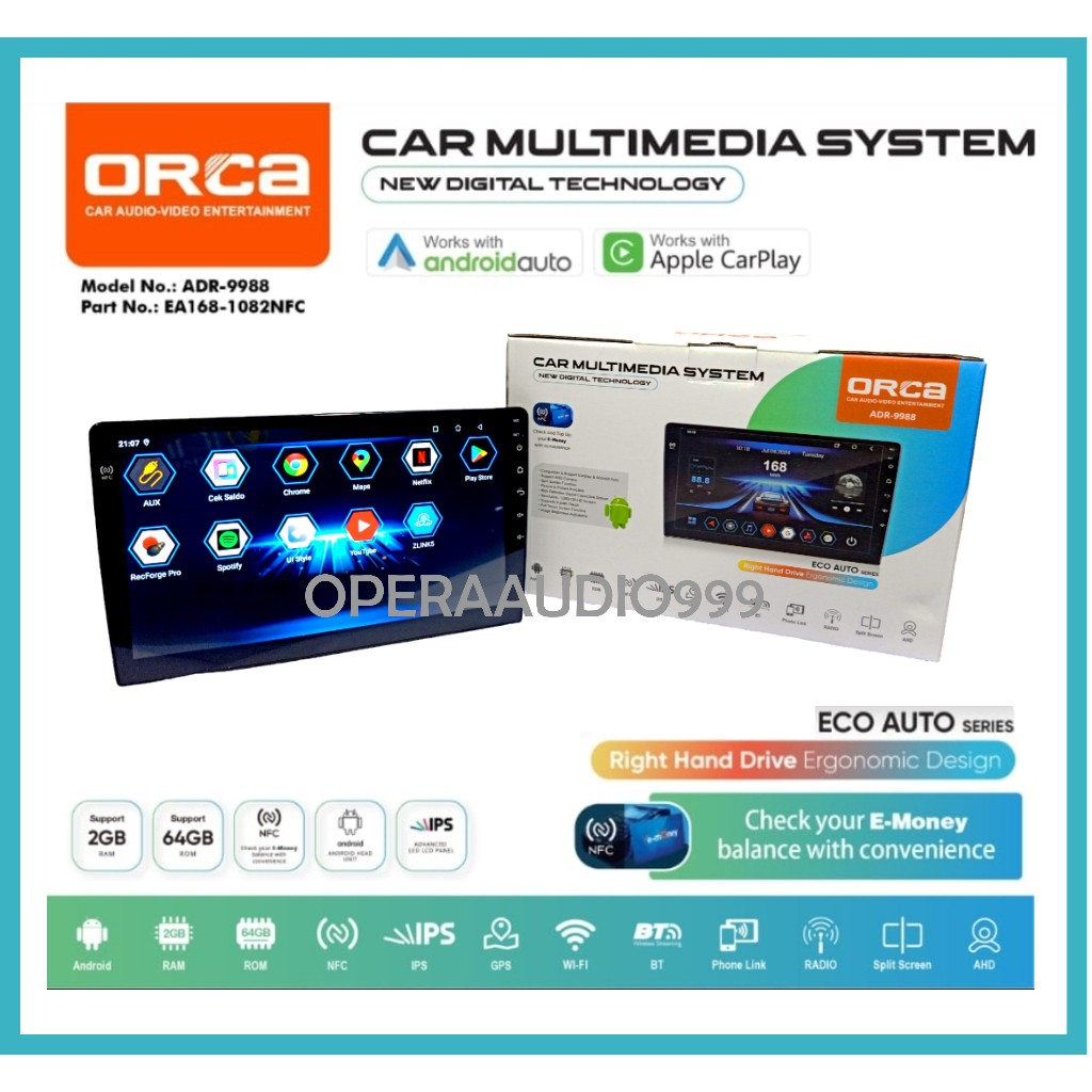 ORCA ECO AUTO NFC ADR 9988 Headunit android 10 dan 9 inch CARPLAY 2/64 NFC GARANSI RESMI ORCA 1 Tahun