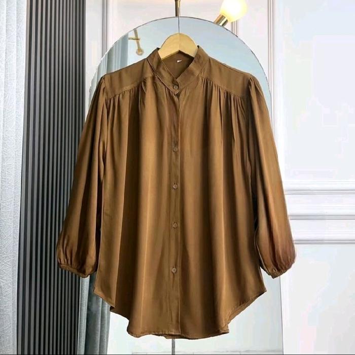 AMENA BLOUSE KEMEJA WANITA RAYON TWILL ATASAN WANITA KEKINIAN BAJU CEWEK DEWASA - AM. HITAM, SIZE L LD 110 CM