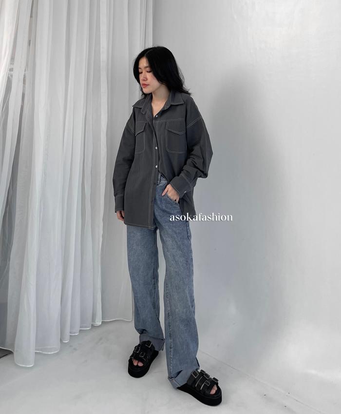 ASOKA KAYLEE SHIRT 2198 - ATASAN WANITA KEMEJA KANTOR/CASUAL - CKET SHIRT BASIC OVERSIZE LINEN BAJU CASUAL - BLACK