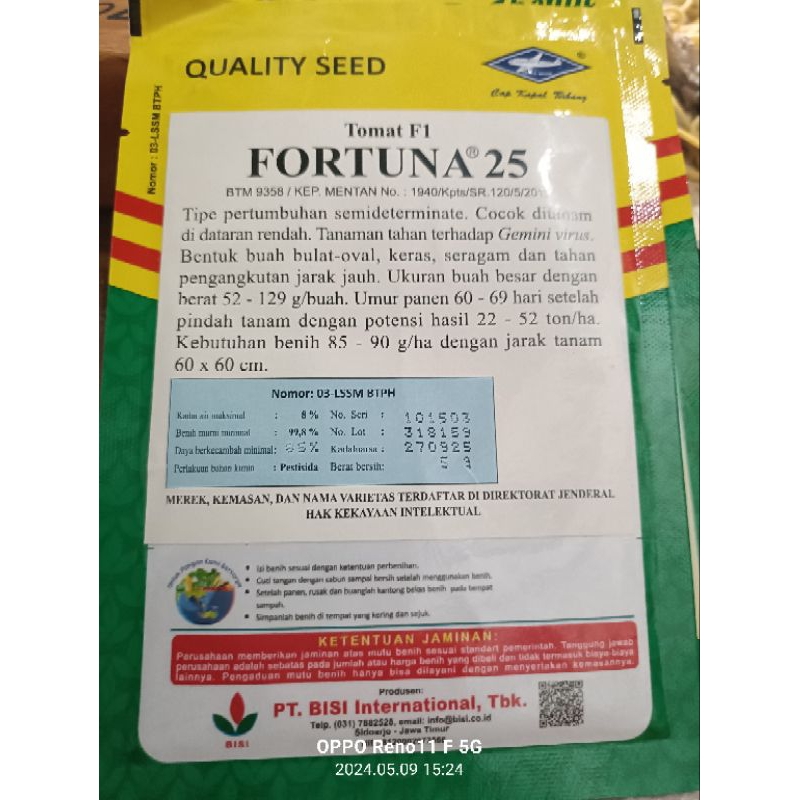 Benih tomat F1 FORTUNA 25 Gantian dr FORTUNA 23 dr BISI kemasan 5 gr.isi 1750±.Produk original pabrik