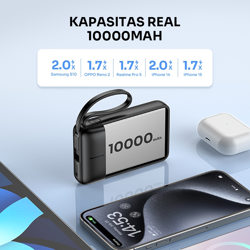 Robot Smart Powerbank Mini 10000Mah Bisa Di Gantung , Charger 2 Perangkat Bersamaan 37Wh Fast Charging Built-In Cable Us