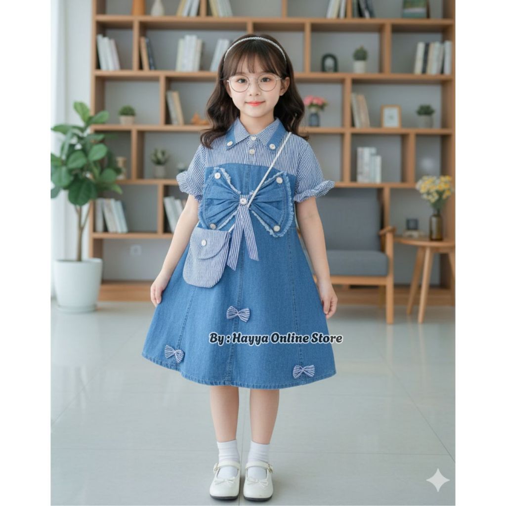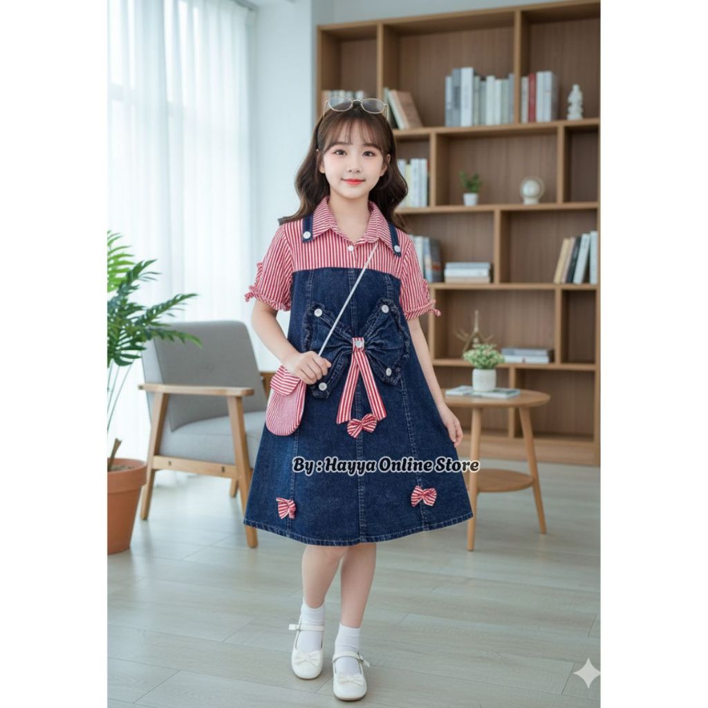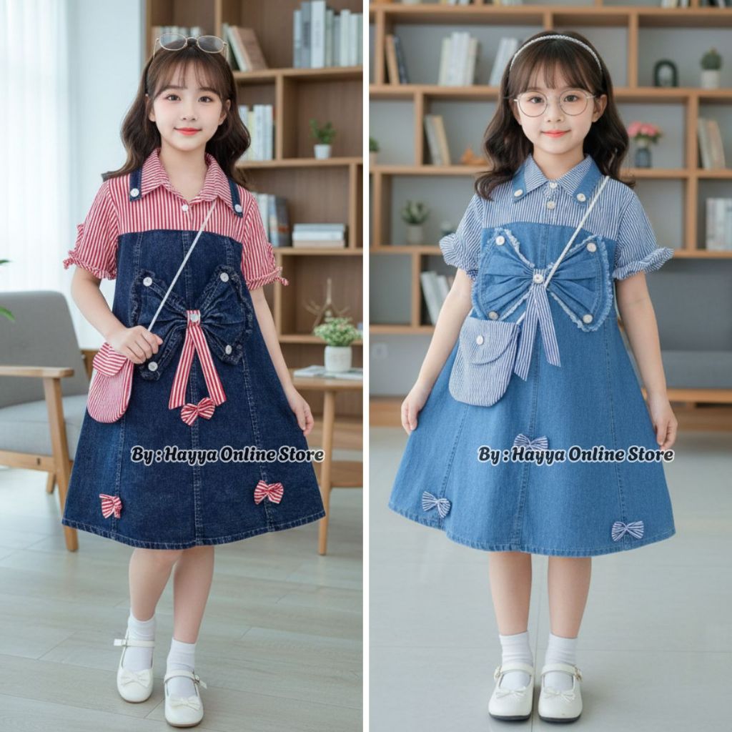Midi Dress Jeans Akira Anak Perempuan Variasi Pita Jeans Cantik + Free Tas Usia 2-10 Tahun - Dress Jeans Mix Katun Salur