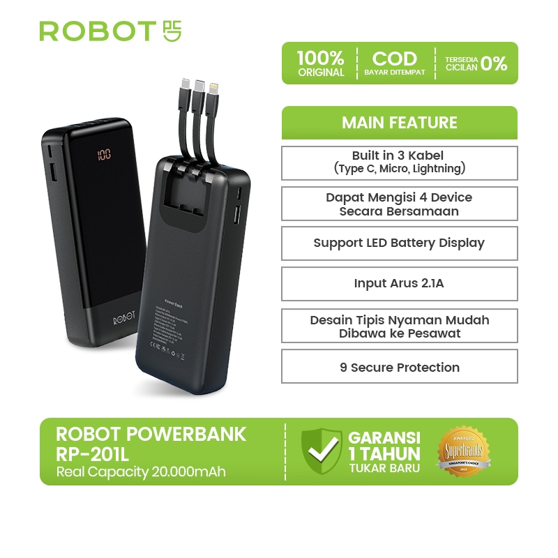 Robot Powerbank 20000Mah Fast Charging + Kabel Bawaan 3-In-1 Type-C, Lightning, Micro, Power Bank Kapasitas Besar High C