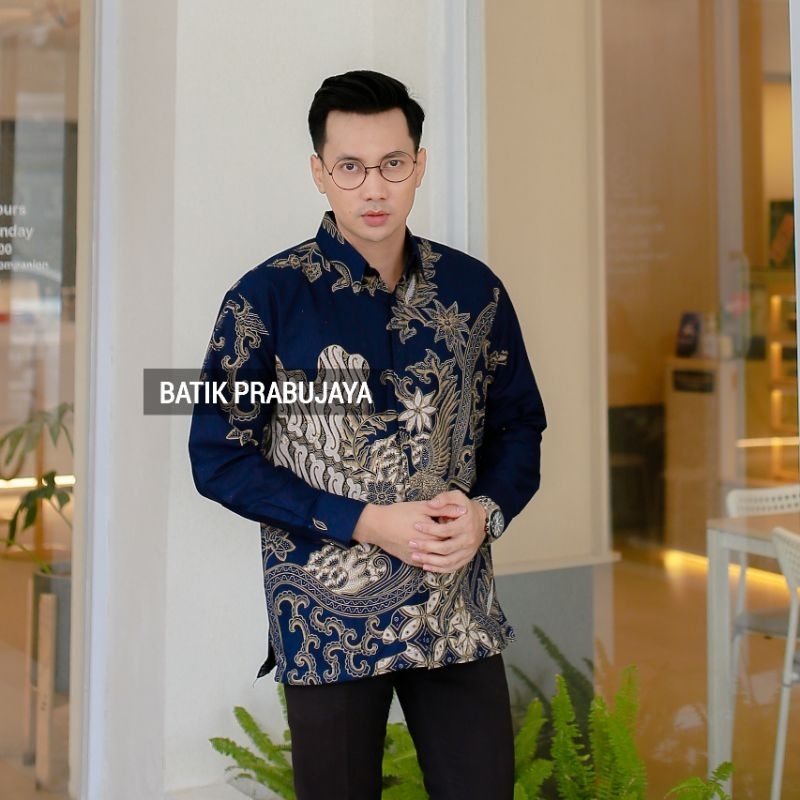 SELING NAVY Kemeja Batik Pria Lengan Panjang Modern Premium Jumbo Slim fit - Baju Batik Pria Cowok Kondangan Pesta Seragam Sragam Kerja Kantor