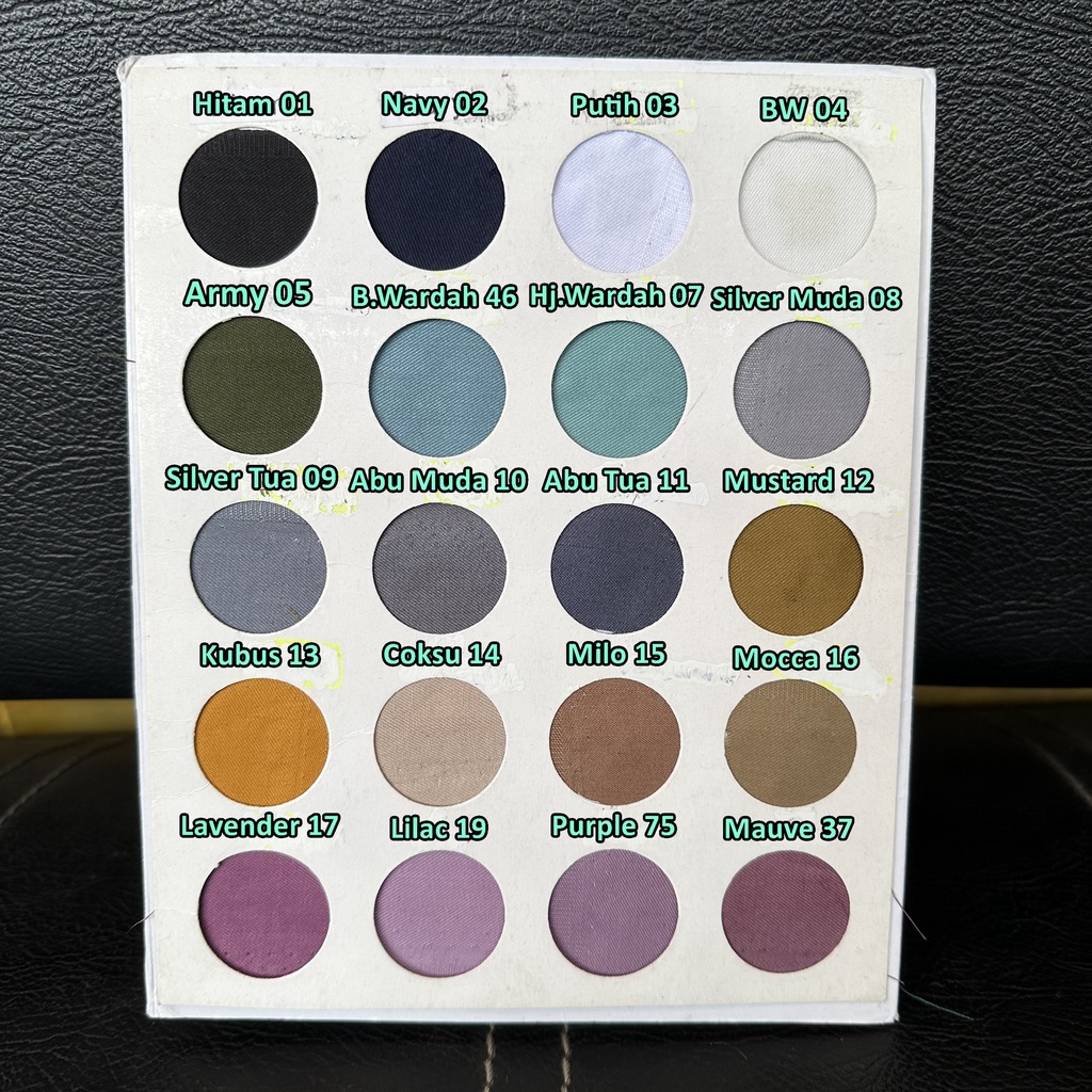 HITAM 01, NAVY 02, PUTIH BERSIH 03, BROKENWHITE/BW 04, ARMY 05, WARDAH 06, HIJAU WARDAH 07, MUSTARD 12, KUBUS/KUNYIT 13, SILVER MUDA 08/05/06, SILVER TUA 09, ABU MUDA 10, ABU TUA 11, COKLAT SUSU 14, MILO 15, MOCCA 16, LAVENDER 17, DASTY 18, LILAC 19/36, PURPLE(LILAC TUA) 75, MAUVE(DW) 37, TERONG 38, MAROON 20, MAROON TUA 74/15, PEACH 21, SALEM PASTEL 27, BABY BLUE/OCEAN 23, DUSTY BLUE 39, TURKIS 24, LEMON 44, HIJAU PUCUK 29, OLIVE 35, SAGE(AVOCADO) 61, HIJAU BOTOL 26, FANTA(FUCHSIA) 41, TOSCA 25, KOPI TUA 34, BABY PINK 43, HIJAU LUMUT 40, BIRU ELEKTRIK 73, MERAH 42, SAGE GREEN/SMEN 71, DENIM 48, MINT 22/29