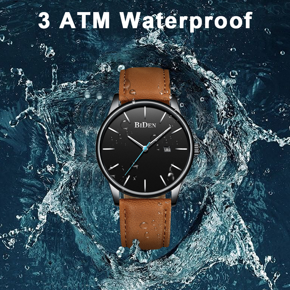 BIDEN Jam Tangan Pria Anti Air Santai Olahraga Kuarsa Jam Tali Kulit Otomatis Date Jam Tangan Cowok Original