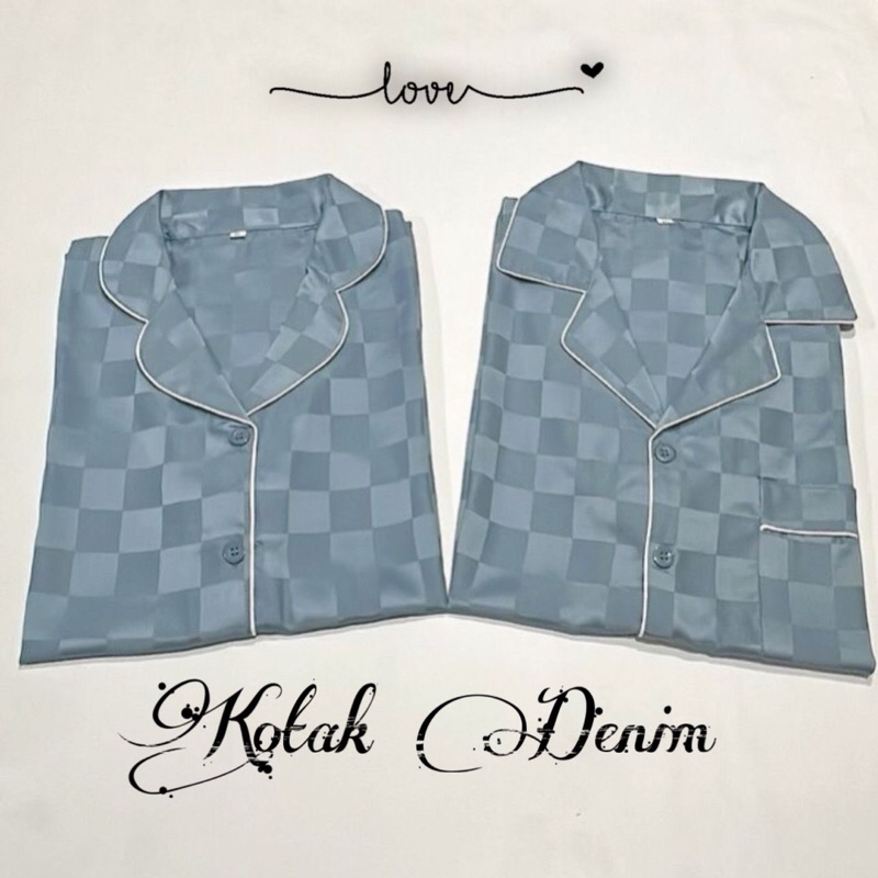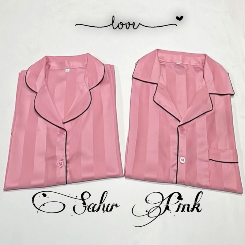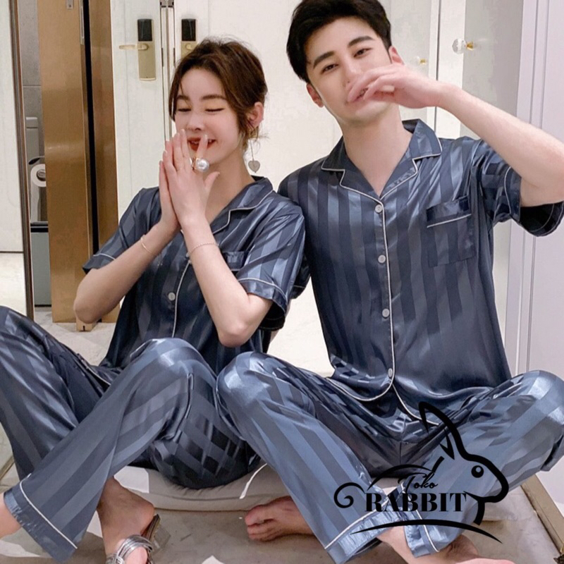 Paket piyama CP couple salur garis kotak satin sutra wanita dan pria lengan pendek celana panjang