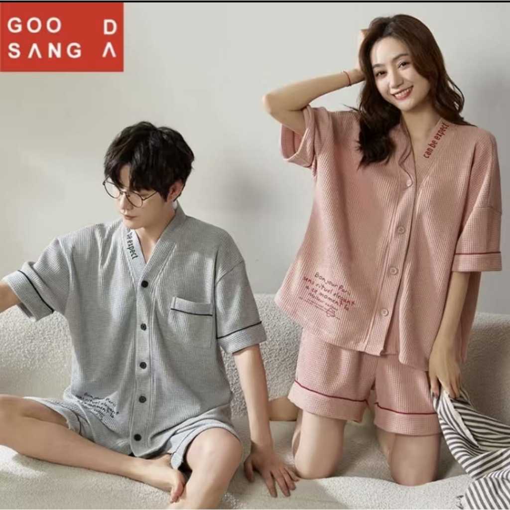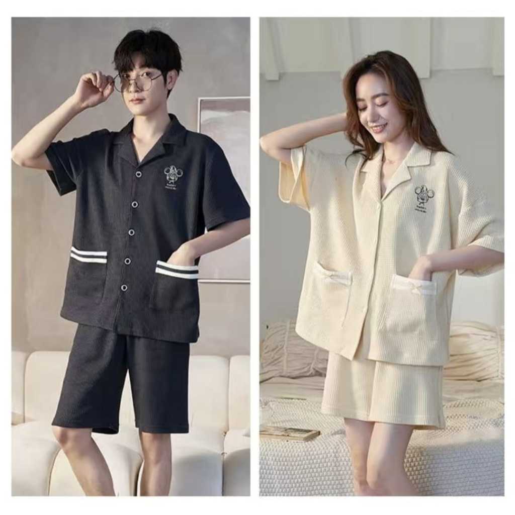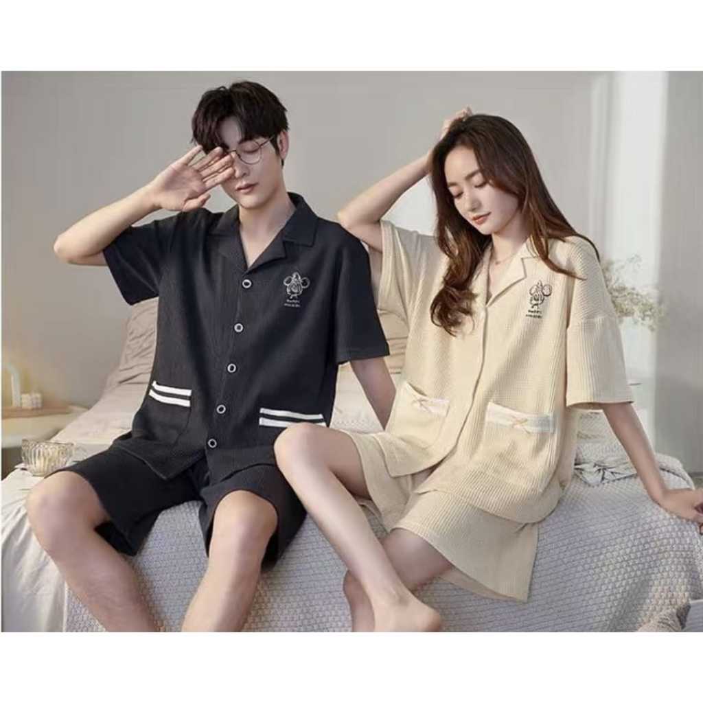 Baju tidur piyama pendek couple kancing depan bahan kaos tebal import