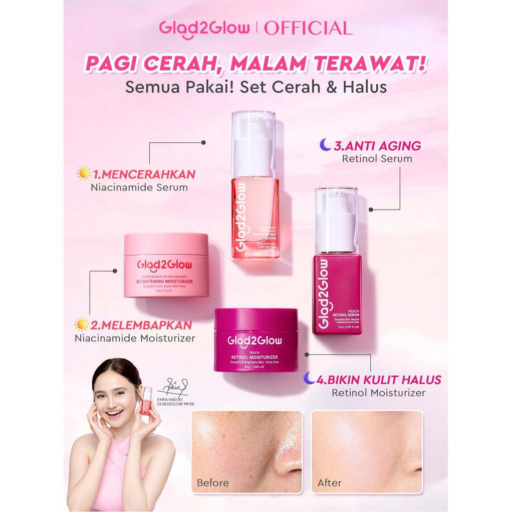 Glad2Glow Paket 4in1 Day & Night Renew G2G Set Cerah Bundle Moisturizer Serum Set Brightening 10 PERSENNiacinamide Peeling Eks