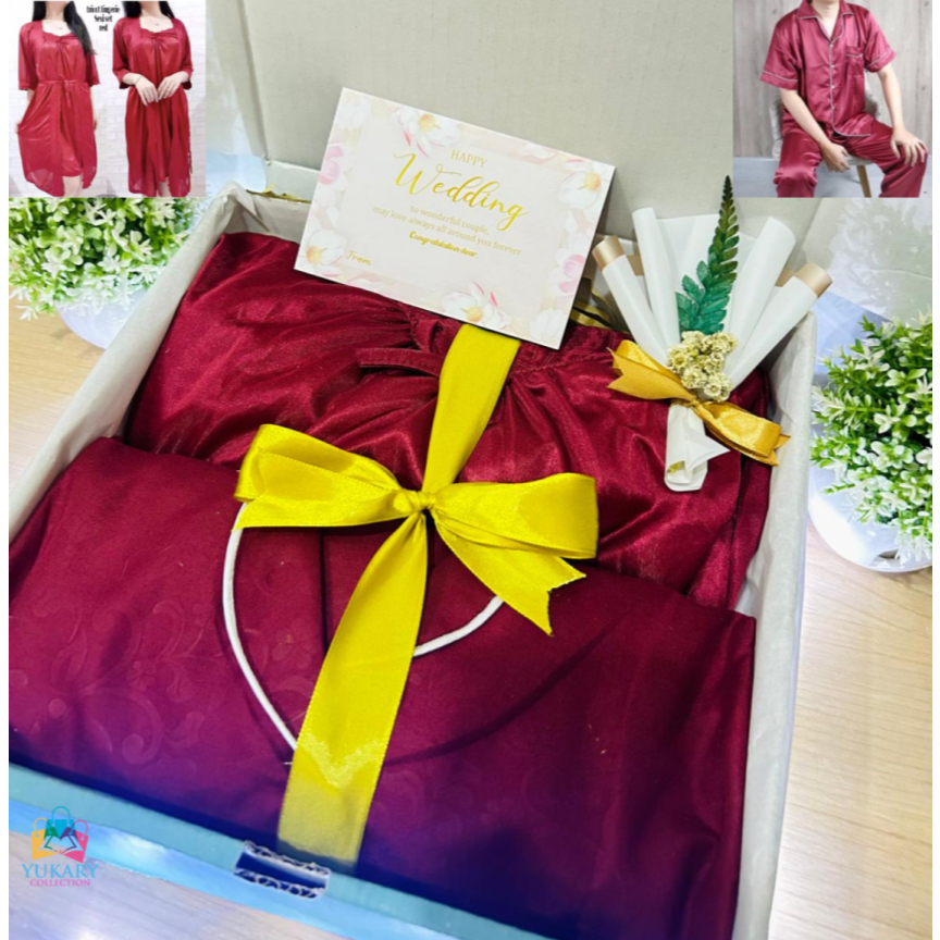 Hampers Wedding Baju Tidur Satin Couple/Piyama Couple/ Hadiah Pernikahan Setelan Piyama dan Lingerie