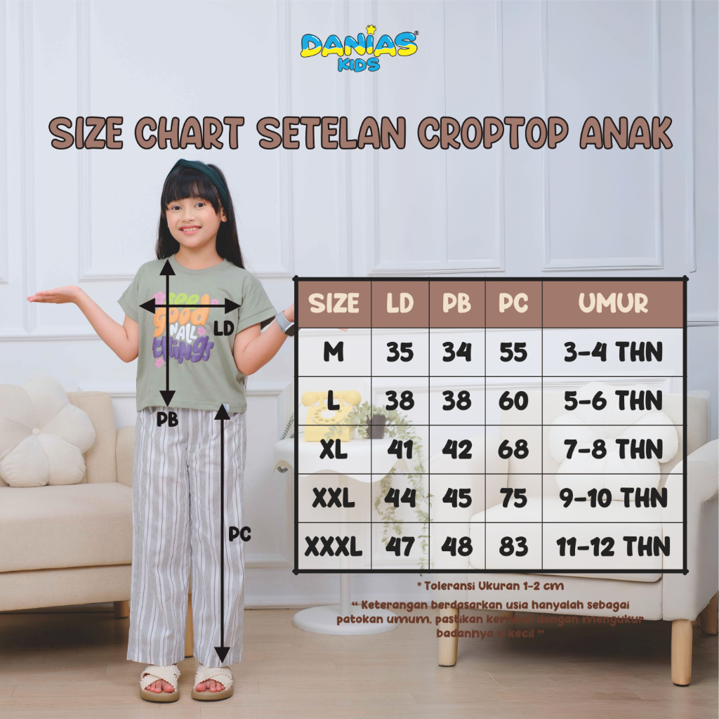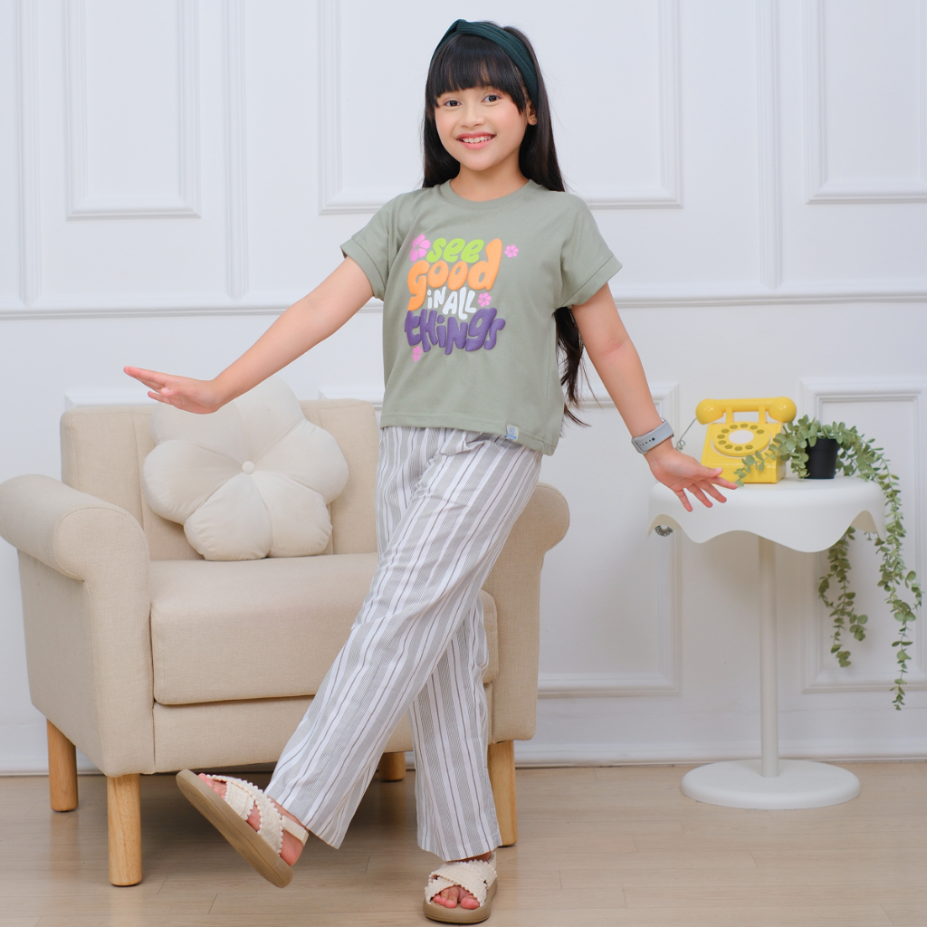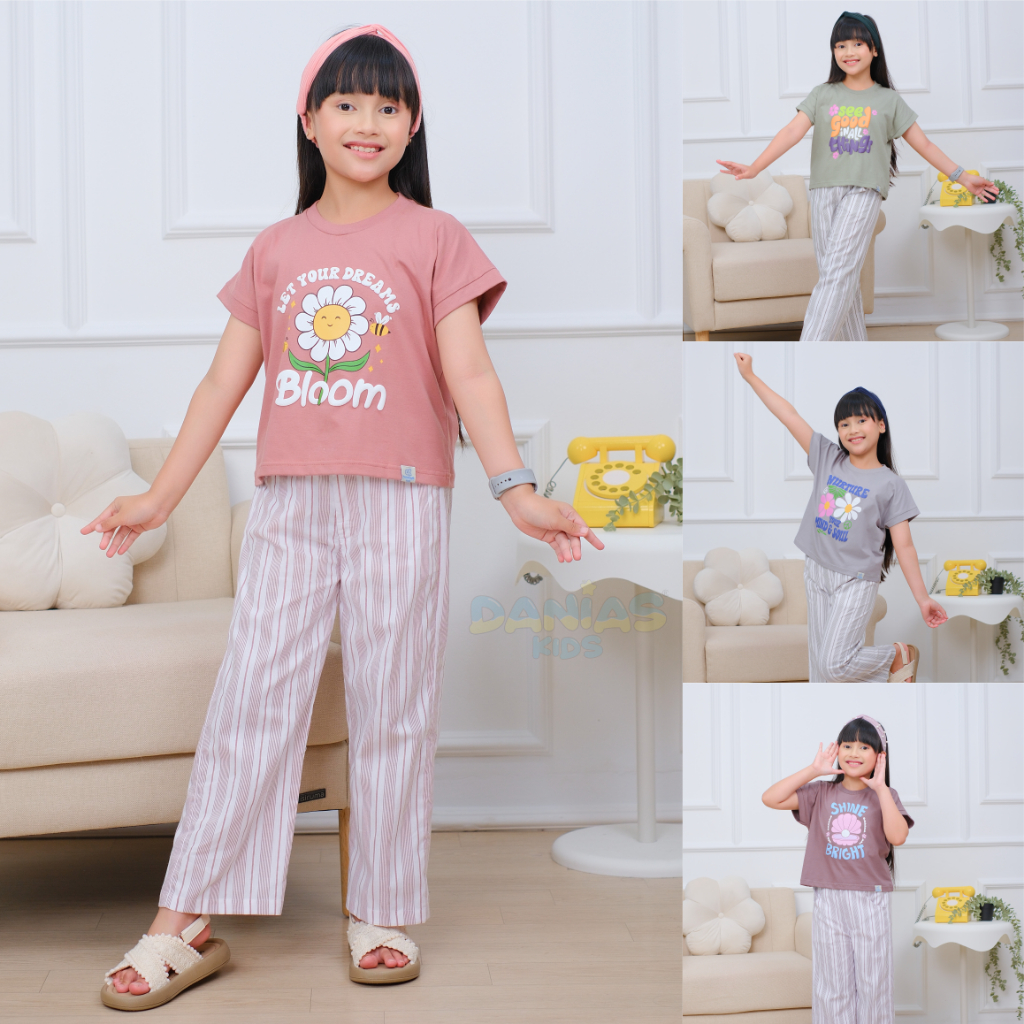 Setelan Croptop Anak Perempuan Dengan Celana Salur Sablon Timbul 100 PERSEN Katun Daniaskids (3-12 Tahun)