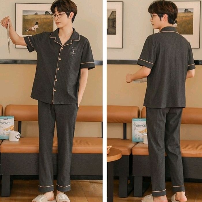 Rulif Piyama Baju Tidur Wanita Pria Couple Dewasa Bahan Katun Halus Lengan Pendek Celana Panjang Krah vneck Rebekka